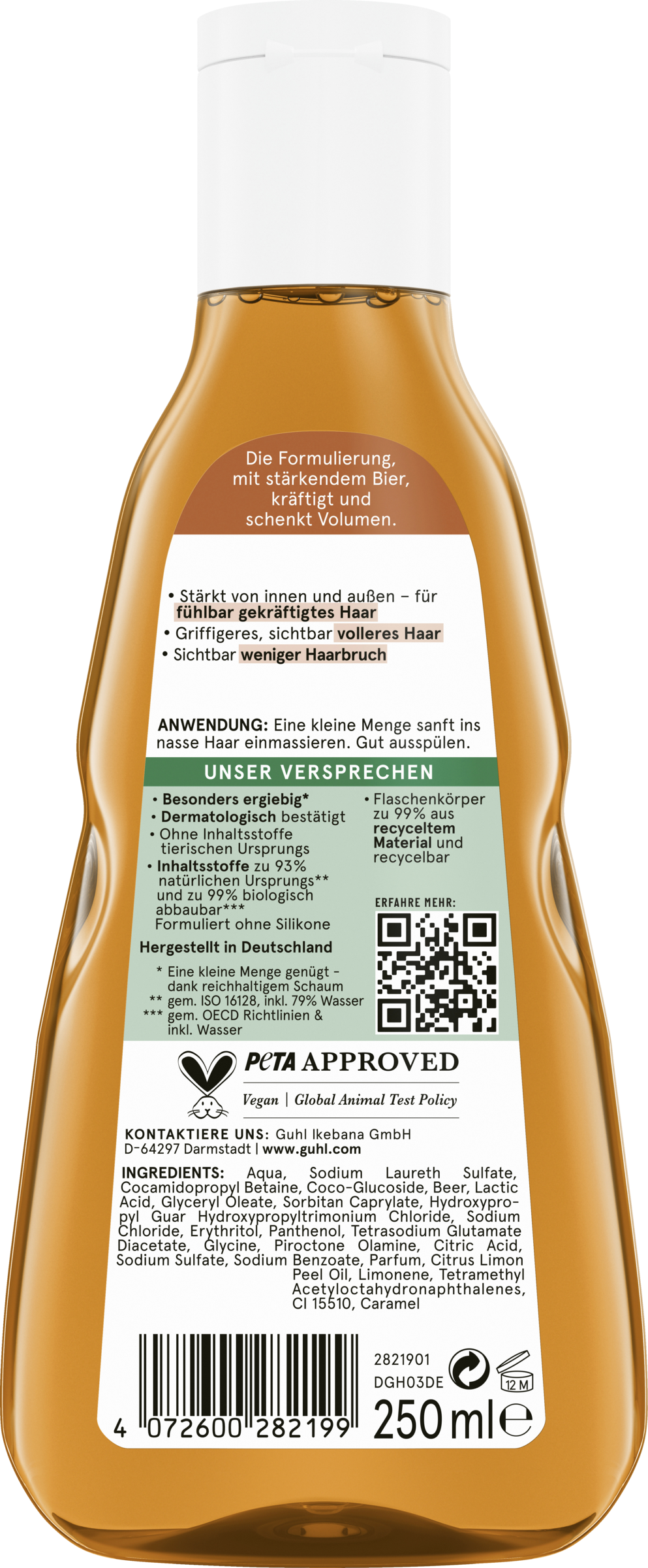 Guhls shampooer imponerer med deres kvalitet. Formuleringerne er skånsomme mod hovedbunden, dermatologisk godkendte og særligt økonomiske - takket være det fyldige, silkebløde skum. Ingredienserne i Intensive Strengthening Shampoo er 93 % naturlige* og 99 % biologisk nedbrydelige **. Guhl bruger ingen silikoner eller animalske ingredienser i sine formuleringer. De producerer vores shampooer i Tyskland og sørger også for, at emballagen er lavet af 99 % genbrugsmateriale og selv kan genbruges. Det er vores Guhl-løfte til verden.