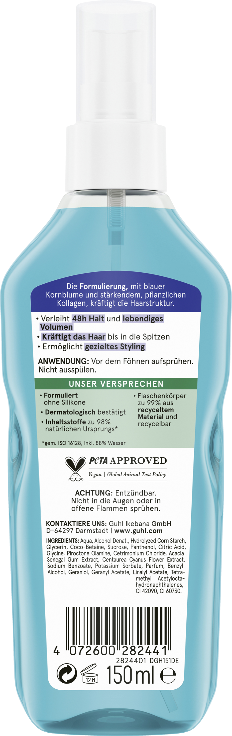 Guhl Long-term Volume - Den miljøvenlige serie til stærkt, voluminøst hår. Serien med langvarig volumen med en formulering af kornblomstekstrakt og plantekollagen stabiliserer og styrker håret og giver det levende volumen. Den silikonefri serie har en vegansk formel fuld af naturlige, bionedbrydelige ingredienser og genbrugte emballagematerialer. De langsigtede volumenprodukter er fremstillet i Tyskland og uden ingredienser af animalsk oprindelse og giver håret fylde og volumen på en miljøvenlig og bæredygtig måde.