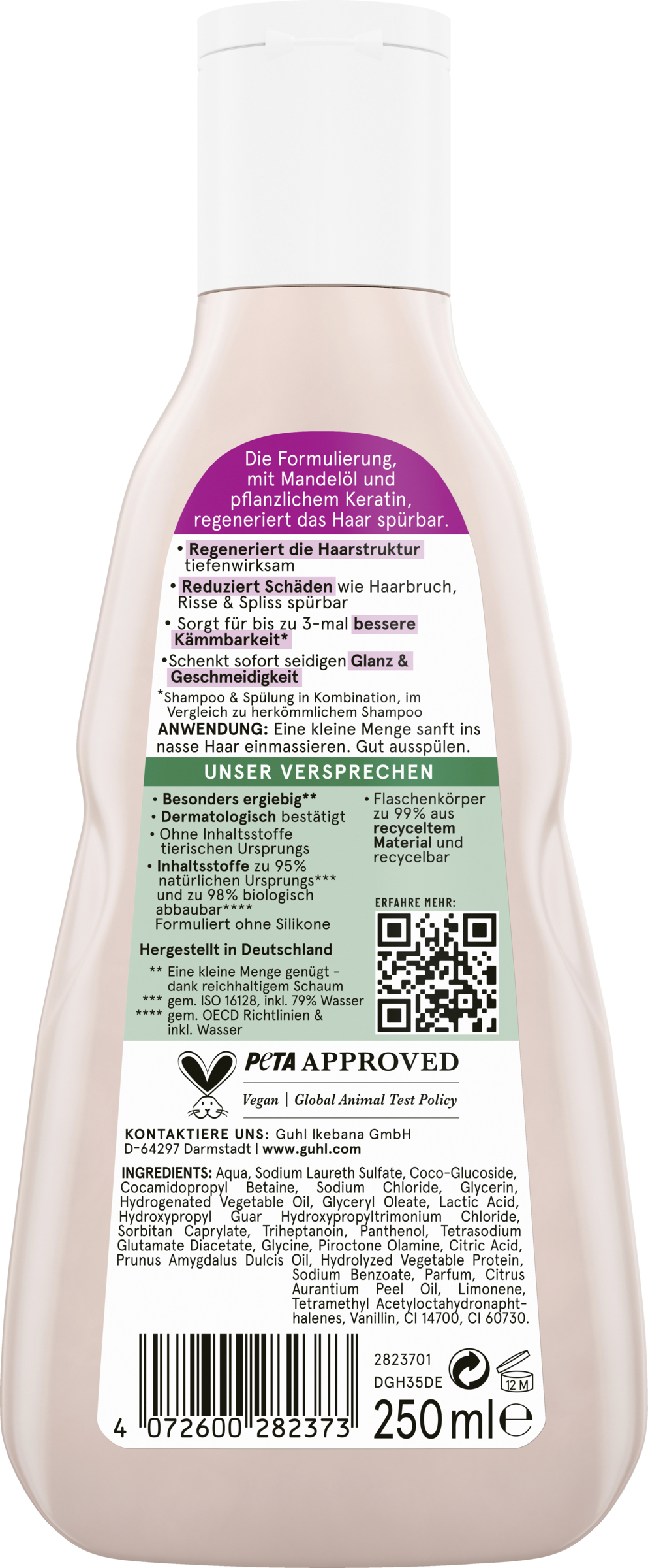 Guhls shampooer imponerer med deres kvalitet. Formuleringerne er skånsomme mod hovedbunden, dermatologisk godkendte og særligt økonomiske - takket være det fyldige, silkebløde skum. Ingredienserne i Repair & Restore Shampoo er 95 % naturlige* og 98 % biologisk nedbrydelige **. Silikoner og animalske ingredienser er helt undgået i formuleringerne. Guhl fremstiller sine shampooer i Tyskland og sørger også for, at 99 % af flaskerne er lavet af genbrugsmateriale og selv kan genbruges. Det er Guhls løfte til verden.