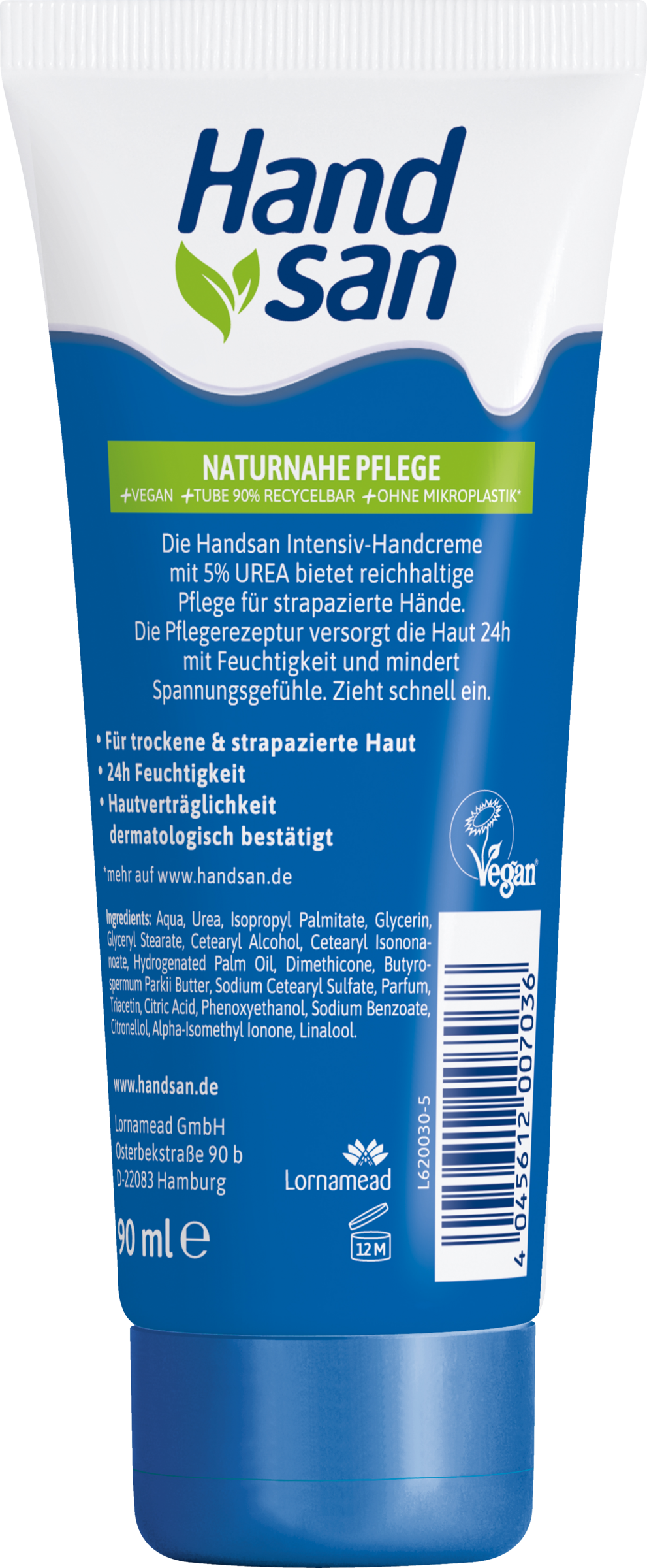 Handsan intensiv håndcreme med 5% UREA tilbyder righoldig pleje til stressede hænder. Plejeformlen med certificeret BioEcolia® fremstillet af plantesukker giver huden fugt i 24 timer og reducerer følelsen af spænding. Absorberes hurtigt.