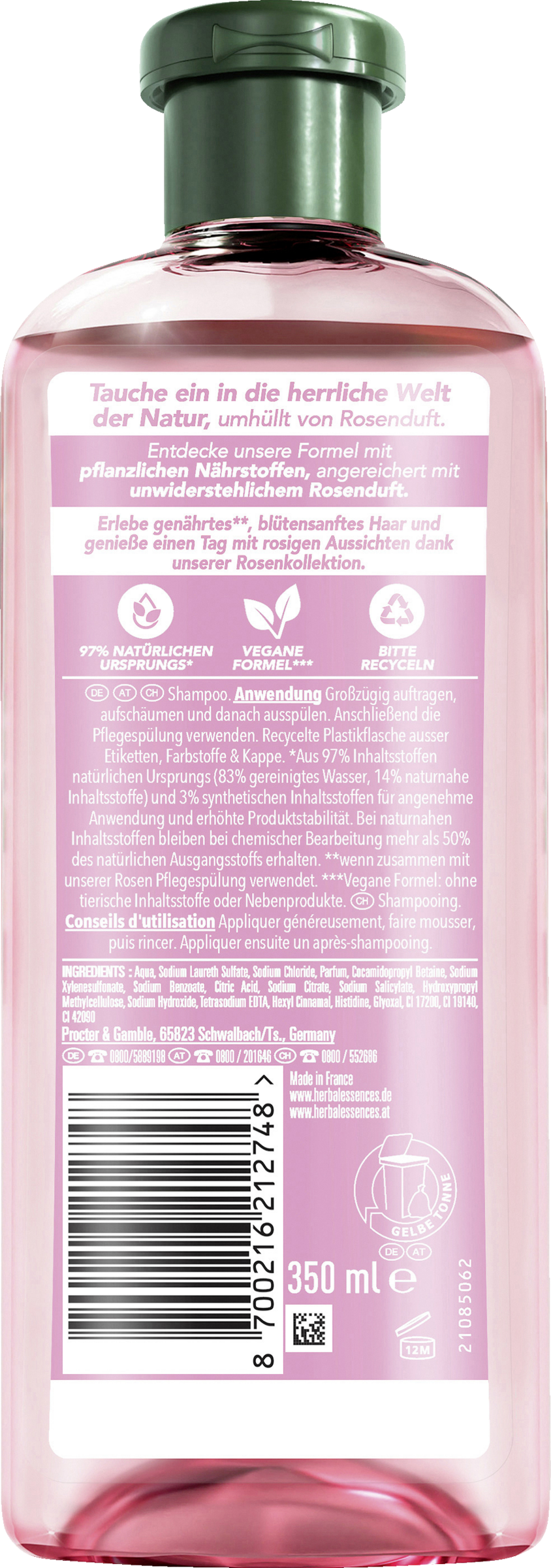 Fordyb dig i naturens forunderlige verden, indhyllet i duften af roser. Herbal Essences Blossom Gentle Shampoo med duft af rose forvandler tørt hår til vidunderligt næret*, silkeblødt hår og efterlader det med en livlig følelse med sin blomsterduft. Formlen med plantebaserede næringsstoffer er beriget med ægte rosenessenser, der er håndplukket i Grasse i Sydfrankrig. Resultatet er en vegansk, fri for silikone, der forvandles til et velduftende skum, som renser og plejer det tørstige hår. Herbal Essences har sammensat et omhyggeligt udvalgte ingredienser af naturlig oprindelse** for at bringe naturens kraft ind i dit badeværelse. Genopret dit hårs naturlige skønhed, og giv dine sanser nyt liv med en komplet hårplejerutine fra den rosenduftende Blossom Gentle-kollektion.
