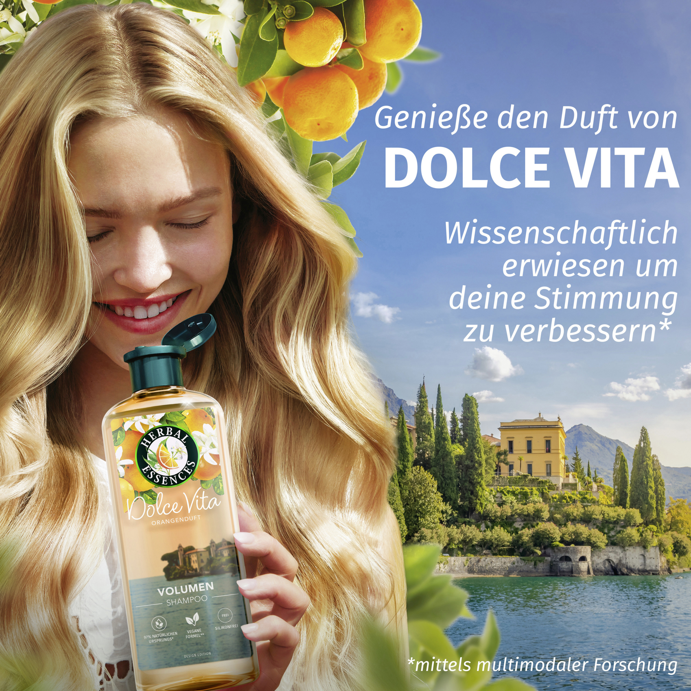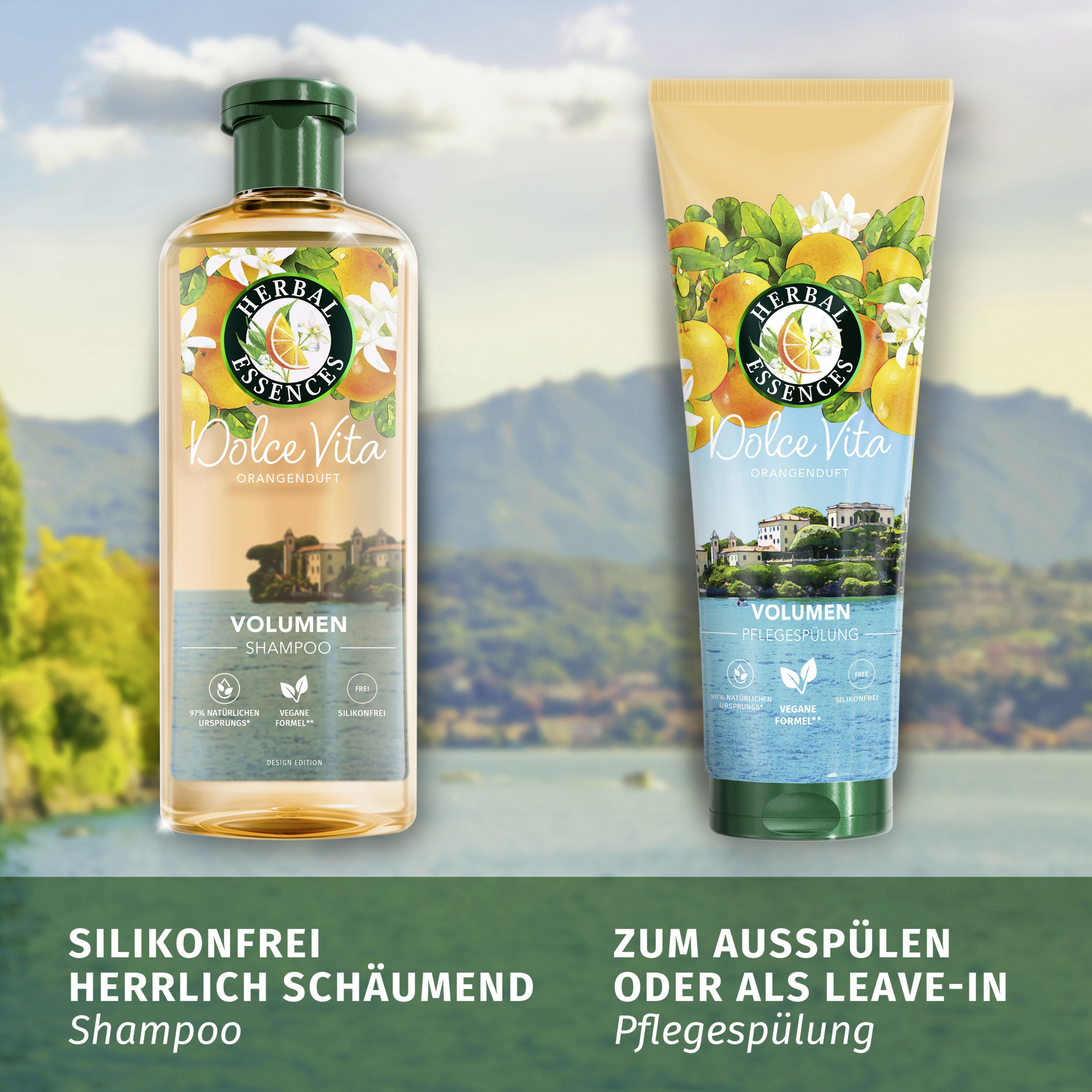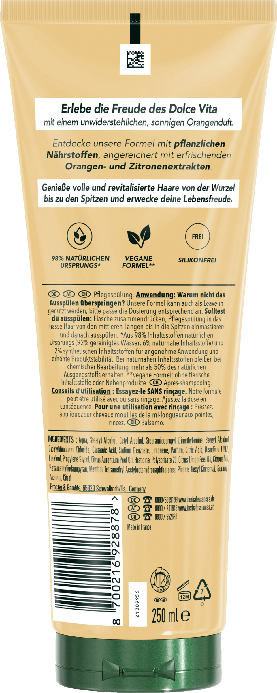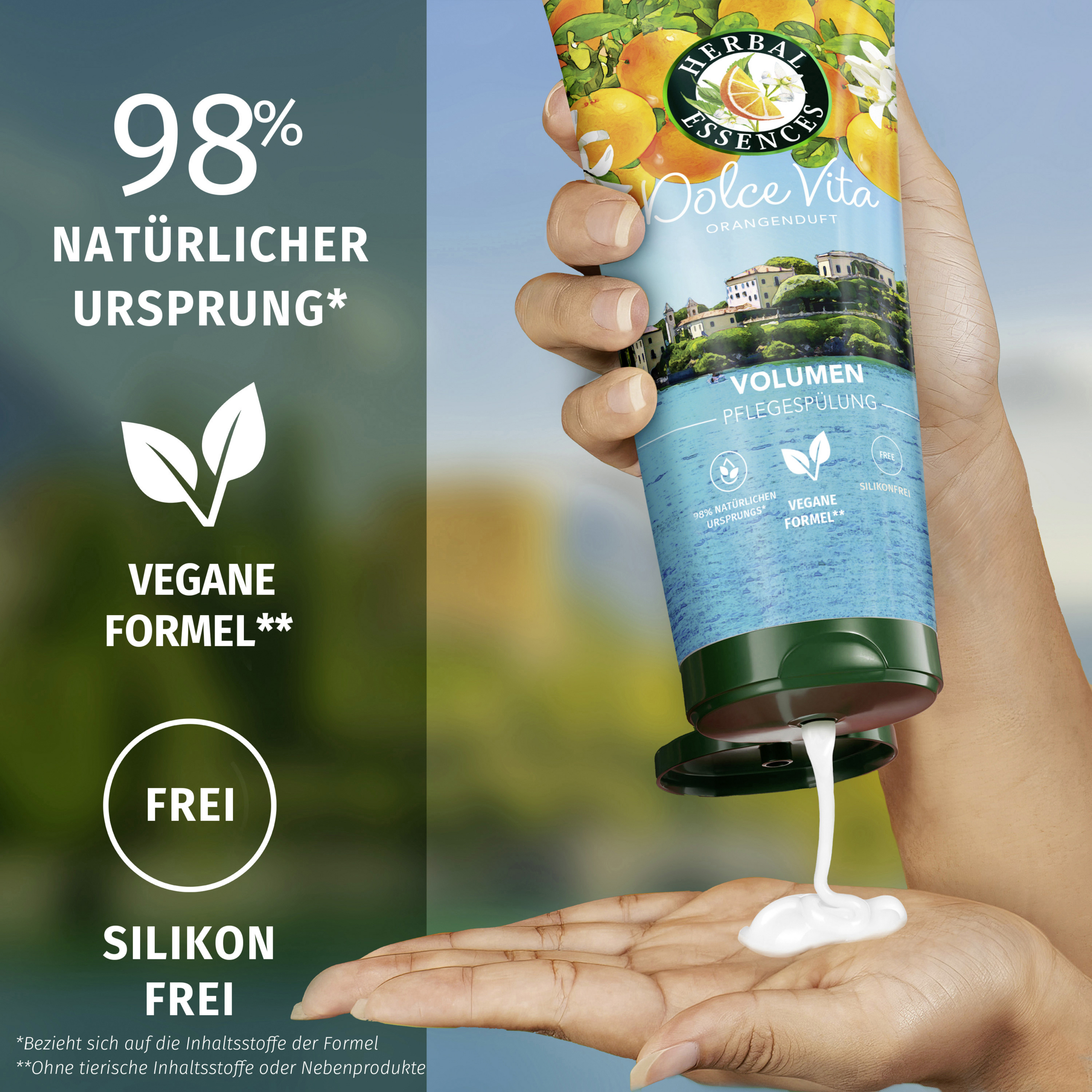 Føl dig solkysset med et strejf af citrusfrugt. Herbal Essences Volume Conditioner med appelsinduft giver fint hår energi fra rod til spids med en liflig citrusduft, der giver dig nyt liv. Den plantebaserede formel er blevet beriget med appelsin- og citronessenser fra Italien for at skabe en revitaliserende, vegansk formel, der er fri for silikoner. Den smarte formel kan bruges på to måder: som balsam, der skylles ud, eller som leave-in, så man kan nyde den revitaliserende følelse i længere tid og samtidig spare på vandet. Herbal Essences har omhyggeligt udvalgt en række ingredienser af naturlig oprindelse* for at bringe naturens kraft ind i dit badeværelse. Genopret dit hårs naturlige skønhed, og giv dine sanser nyt liv med en komplet hårplejerutine fra den appelsinduftende Volume Collection.
