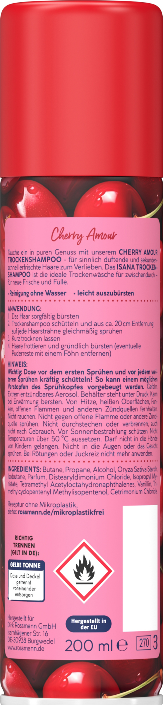 Fordyb dig i ren nydelse med vores CHERRY AMOUR DRY SHAMPOO - for sensuelt duftende hår, der er opfrisket på få sekunder og får dig til at forelske dig. ISANA DRY SHAMPOO er den ideelle tørshampoo til ind imellem - til ny friskhed og fylde.