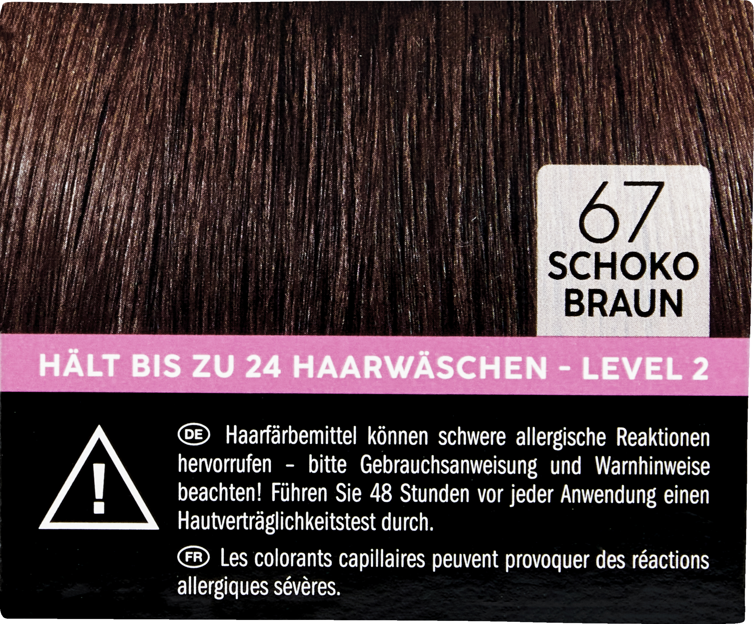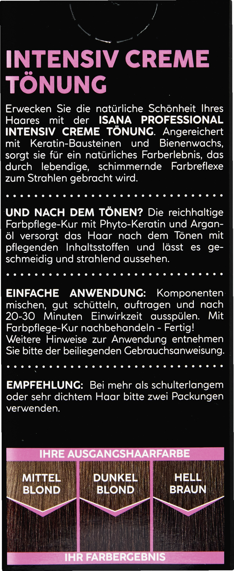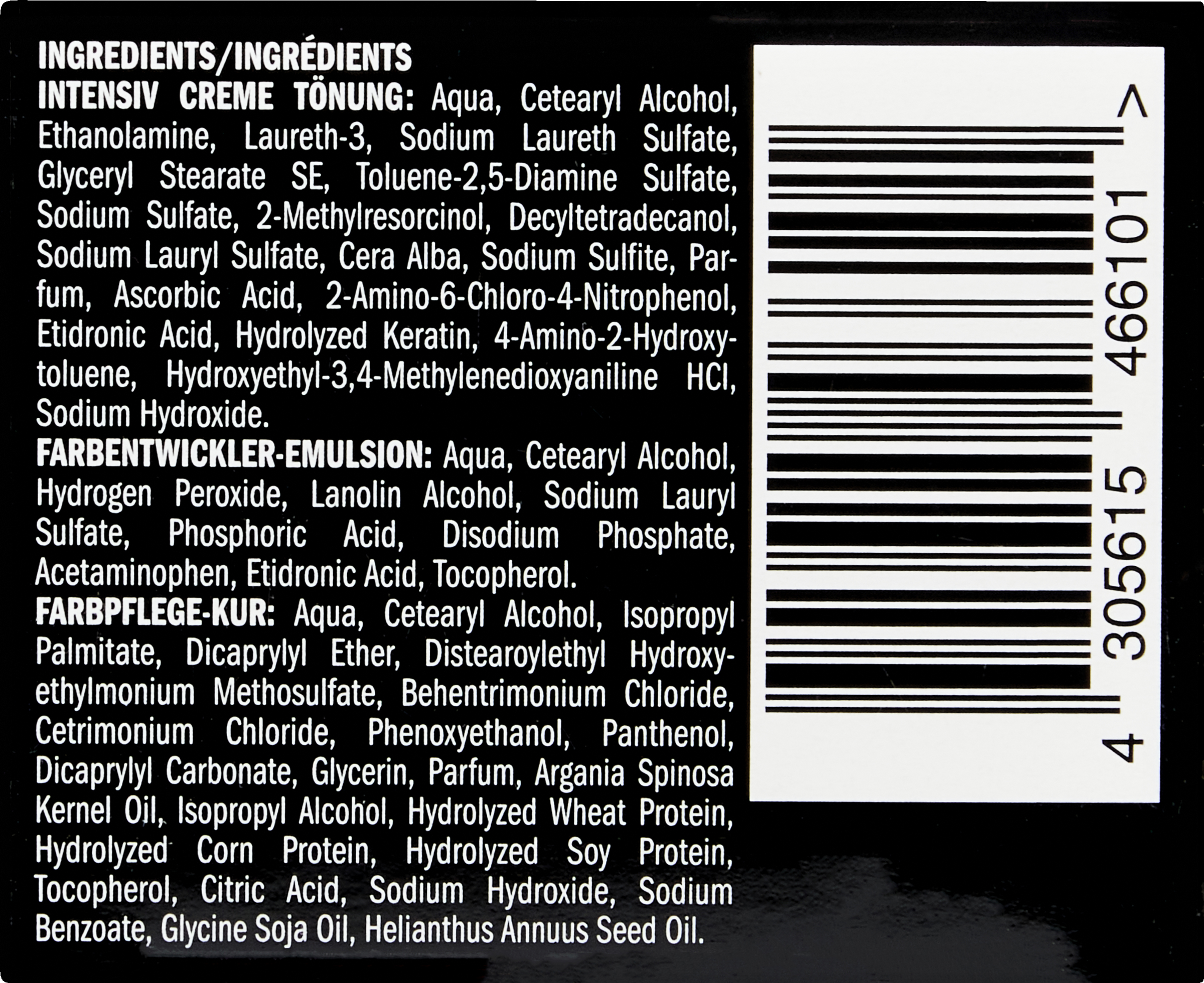 - Intensiv Creme Tönung: Aqua, Cetearyl Alcohol, Ethanolamine, Laureth-3, Sodium Laureth Sulfate, Glyceryl Stearate SE, Toluene-2,5-Diamine Sulfate, Sodium Sulfate, 2-Methylresorcinol, Decyltetradecanol, Sodium Lauryl Sulfate, Cera Alba, Sodium Sulfite, Parfum, Ascorbic Acid, 2-Amino-6-Chloro-4-Nitrophenol, Etidronic Acid, Hydrolyzed Keratin, 4-Amino-2-Hydroxytoluene, Hydroxyethyl-3,4-Methylenedioxyaniline HCl, Sodium Hydroxide.