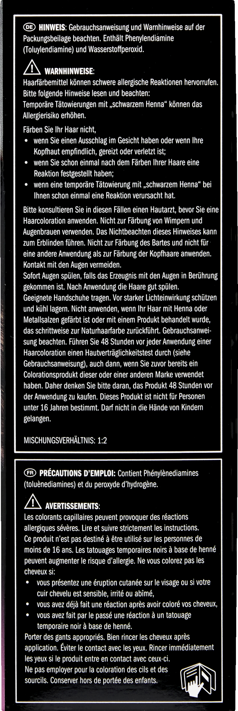Indeholder phenylediamin (toluylendiamin), resorcin og brintoverilte. Hårfarvemidler kan forårsage alvorlige allergiske reaktioner. Læs og overhold følgende anvisninger: Midlertidige tatoveringer med "sort henna" kan øge allergirisikoen. Undlad at farve dit hår,