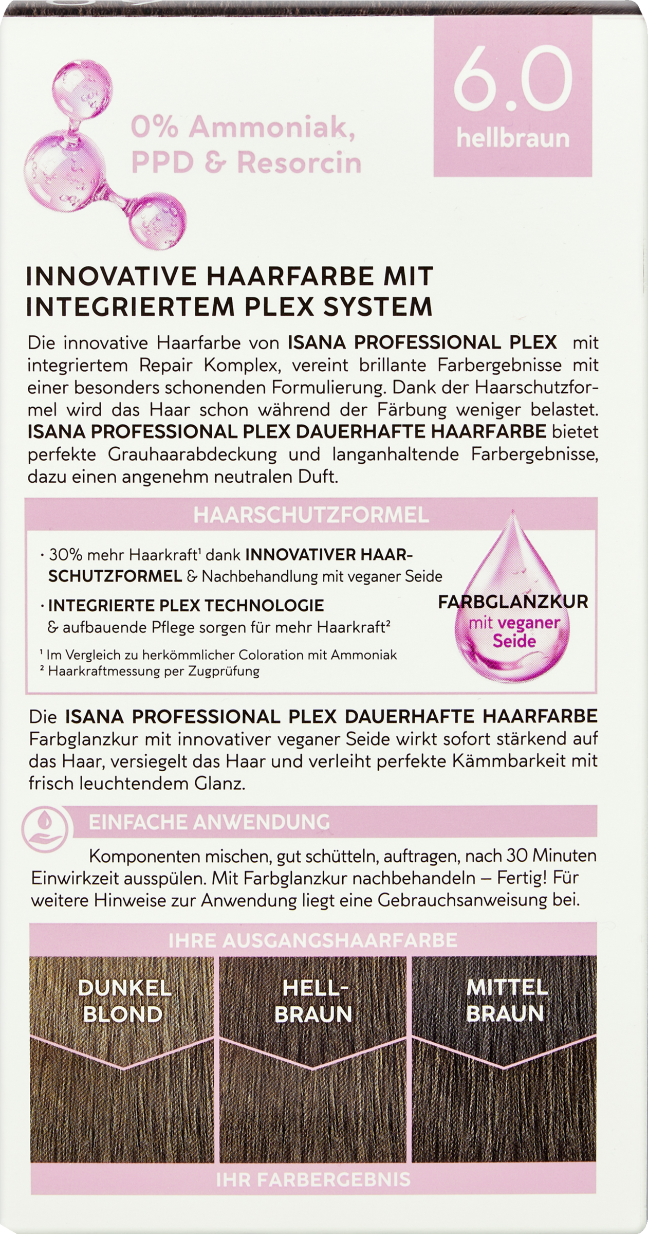 Innovativ Hårfarve med integreret Plex-system - Den innovative Hårfarve fra ISANA Professional Plex med integreret reparationskompleks kombinerer strålende farveresultater med en særlig skånsom formulering. Takket være hårbeskyttelsesformlen belastes håret allerede mindre under farvningen.
