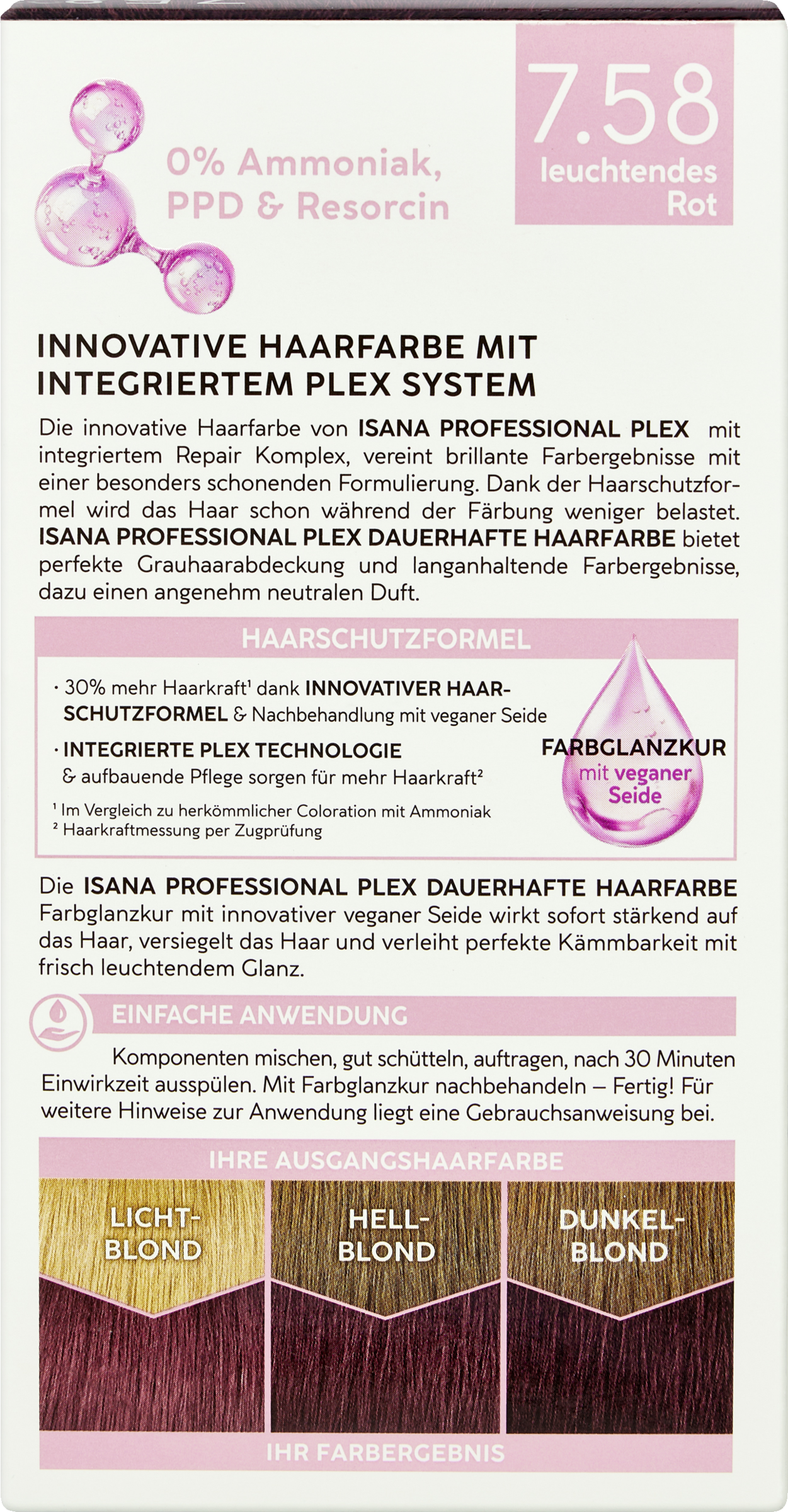 ISANA Professional Plex permanent Hårfarve tilbyder perfekt dækning af gråt hår og langvarige farveresultater samt en behagelig Duft. ISANA Professional Plex permanent Hårfarve glans med innovativ vegansk silke har en øjeblikkelig styrkende effekt på håret, forsegler håret og giver perfekt Nem udredning med en frisk, skinnende Glans.