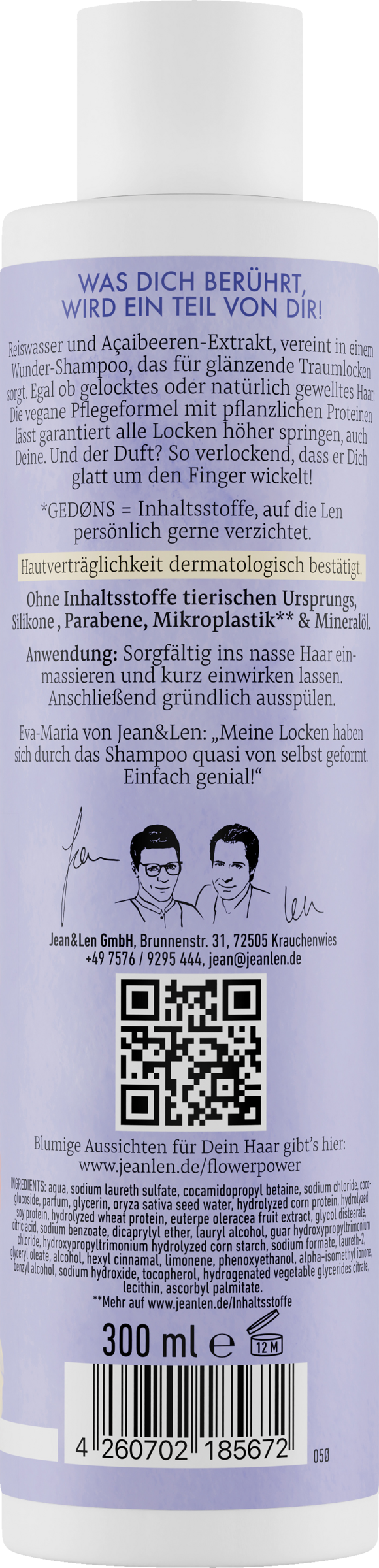 Risvand og ekstrakt af açai-bær. To mirakelprodukter kombineret i vores shampoo, som sikrer glatte drømmekrøller. Den veganske plejeformel er specielt udviklet til krøllet og bølget hår og får med garanti alle krøller til at hoppe højere, også dine. Og den dufter også så fristende!