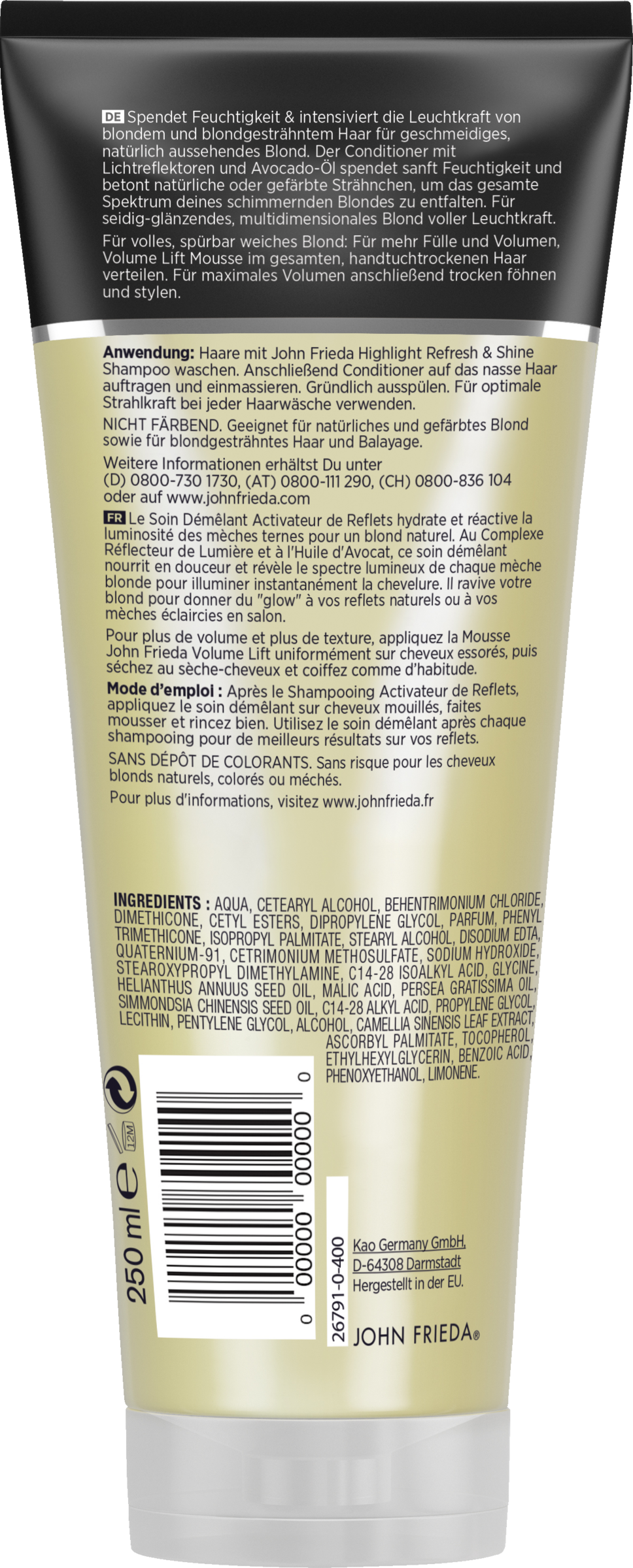 Vask Hår med John Frieda Highlight Refresh & Shine Shampoo . Påfør derefter Hårbalsam i vådt hår og massér ind. Skylles grundigt ud.