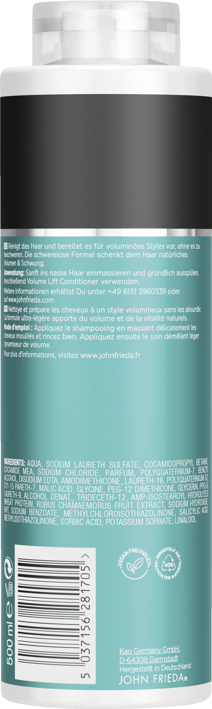 Optimisme er godt! For med positive tanker og godt humør overvinder vi de daglige udfordringer i livet meget lettere: Vi er sprængfyldt med energi, er modigere, mere selvsikre, gladere og i sidste ende mere succesfulde. John Frieda Volume Lift, efterfølgeren til John Frieda Luxurious Volume, løfter håret – og med det humøret. Fint og fladt hår forvandles til naturligt blødt og velplejet hår fyldt med spræl og volumen. Håndgribelig og synlig volumen for en unik følelse af opstemthed.