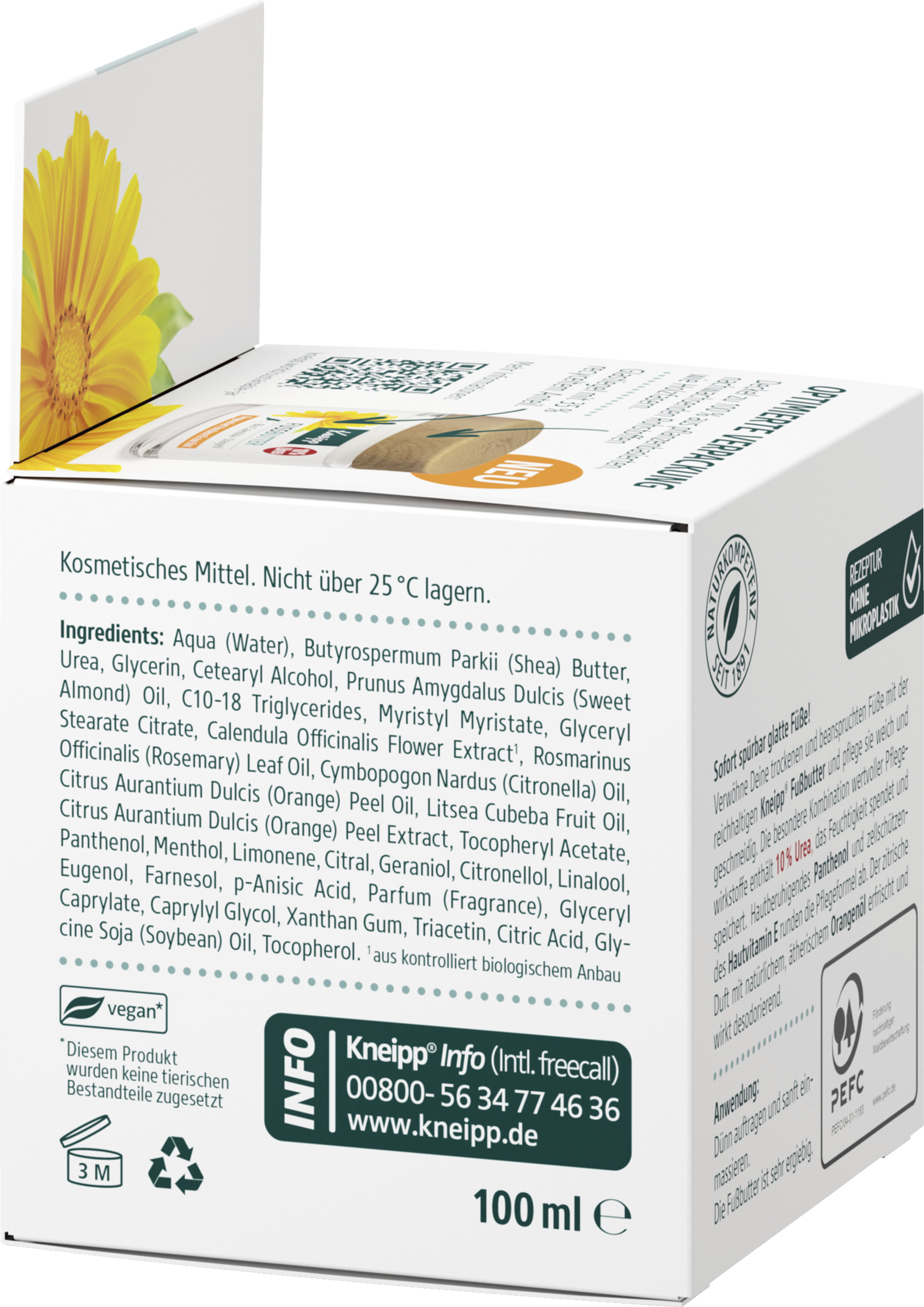 Aqua (Water), Butyrospermum Parkii (Shea) Butter, Urea, Glycerin, Cetearyl Alcohol, Prunus Amygdalus Dulcis (Sweet Almond) Oil, C10-18 Triglycerides, Myristyl Myristate, Glyceryl Stearate Citrate, Calendula Officinalis Flower Extract (aus kontrolliert biologischem Anbau), Rosmarinus Officinalis (Rosemary) Leaf Oil, Cymbopogon Nardus (Citronella) Oil, Citrus Aurantium Dulcis (Orange) Peel Oil, Litsea Cubeba Fruit Oil, Citrus Aurantium Dulcis (Orange) Peel Extract, Tocopheryl Acetate, Panthenol, Menthol, Limonene, Citral, Geraniol, Citronellol, Linalool, Eugenol, Farnesol, p-Anisic Acid, Parfum (Fragrance), Glyceryl Caprylate, Caprylyl Glycol, Xanthan Gum, Triacetin, Citric Acid, Glycine Soja (Soybean) Oil, Tocopherol.