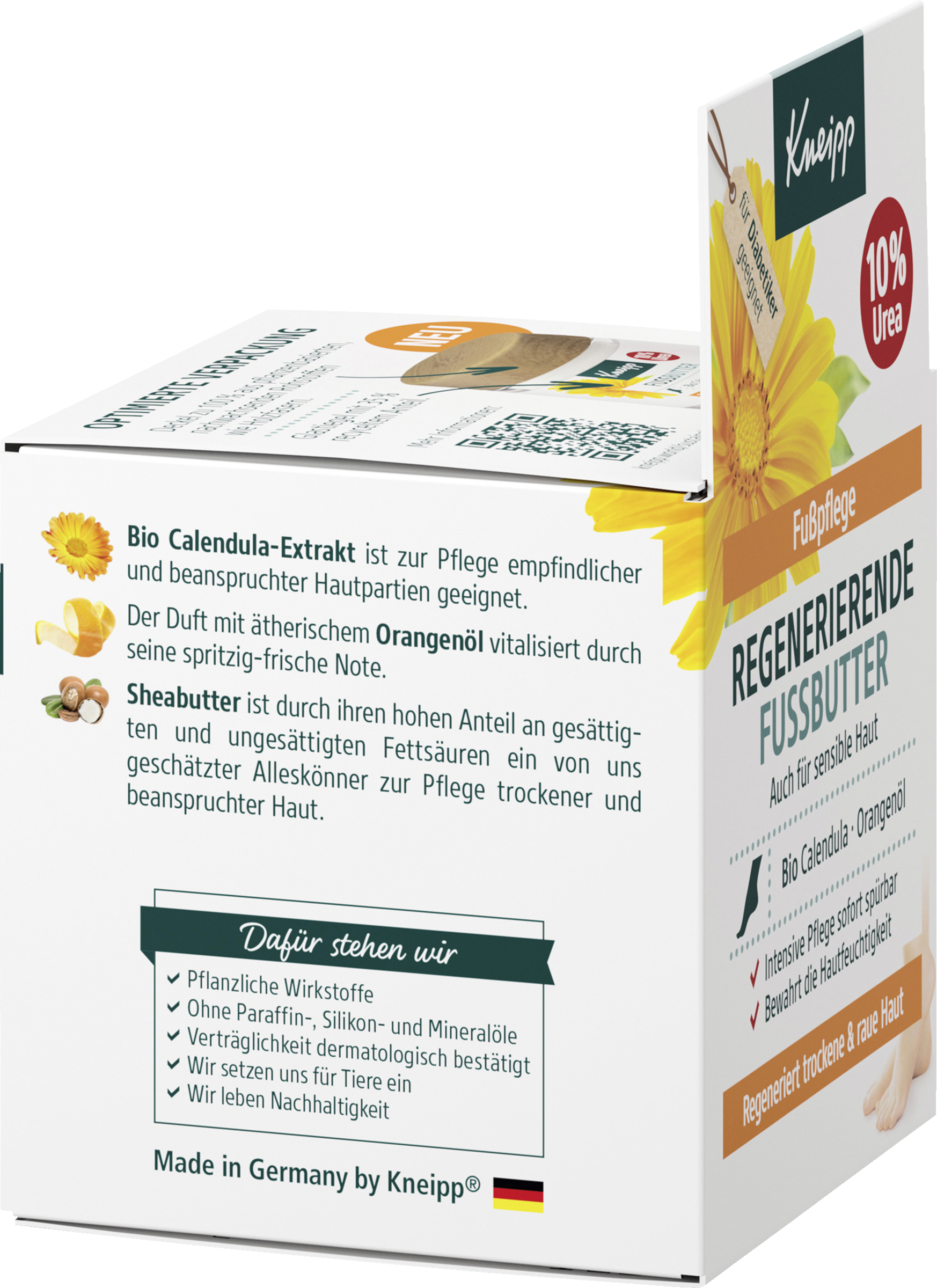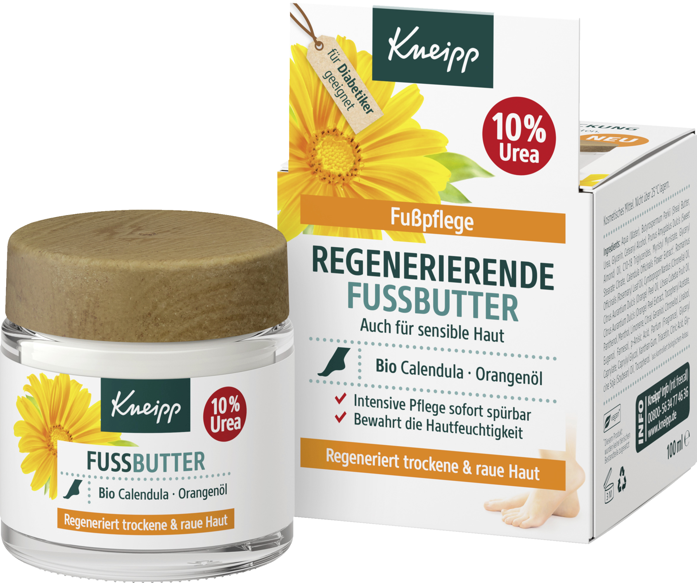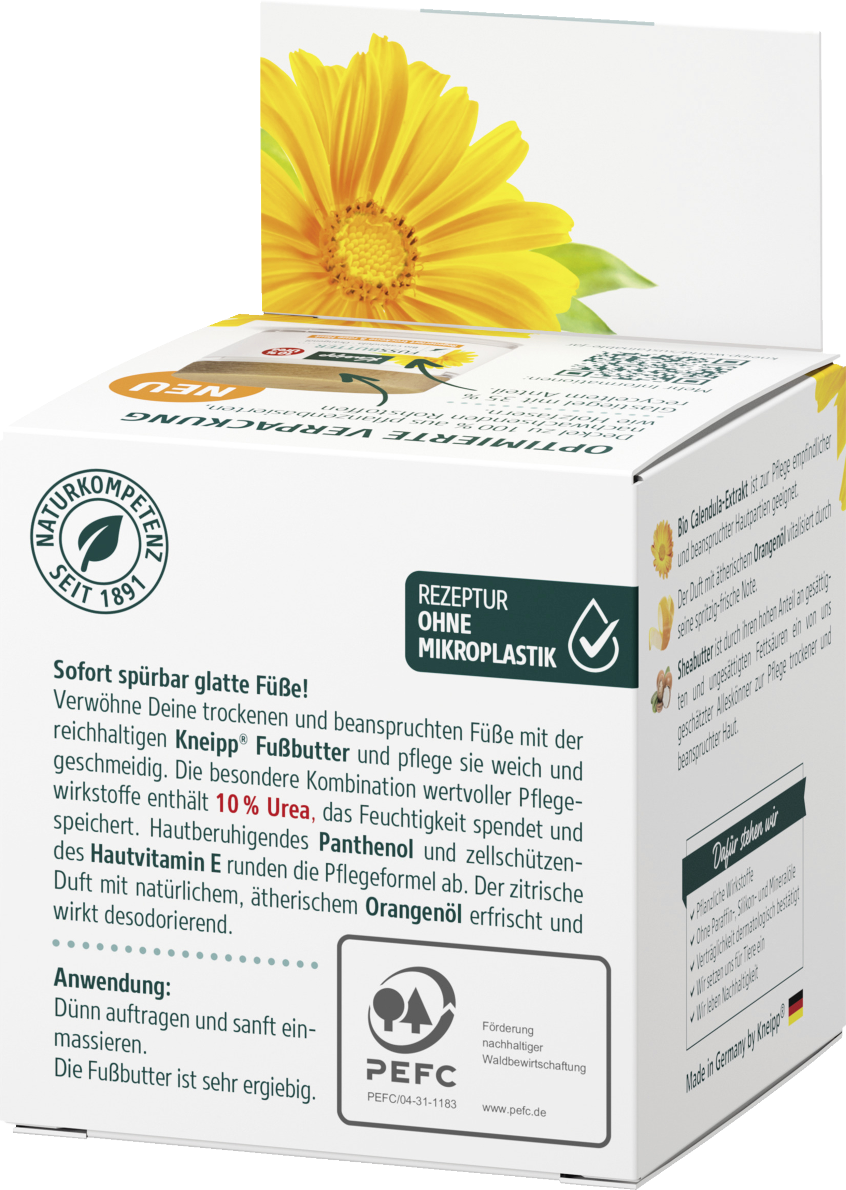 Umiddelbart mærkbart glatte fødder! Forkæl dine tørre og stressede fødder med det rige Kneipp® fodsmør og hold dem bløde og smidige. Den specielle kombination af værdifulde plejeingredienser indeholder 10 % urinstof, som giver og holder på fugten. Hudberoligende panthenol og cellebeskyttende hud E-vitamin runder plejeformlen af. Duft med naturlig, æterisk Appelsinolie opfrisker og virker deodoriserende.