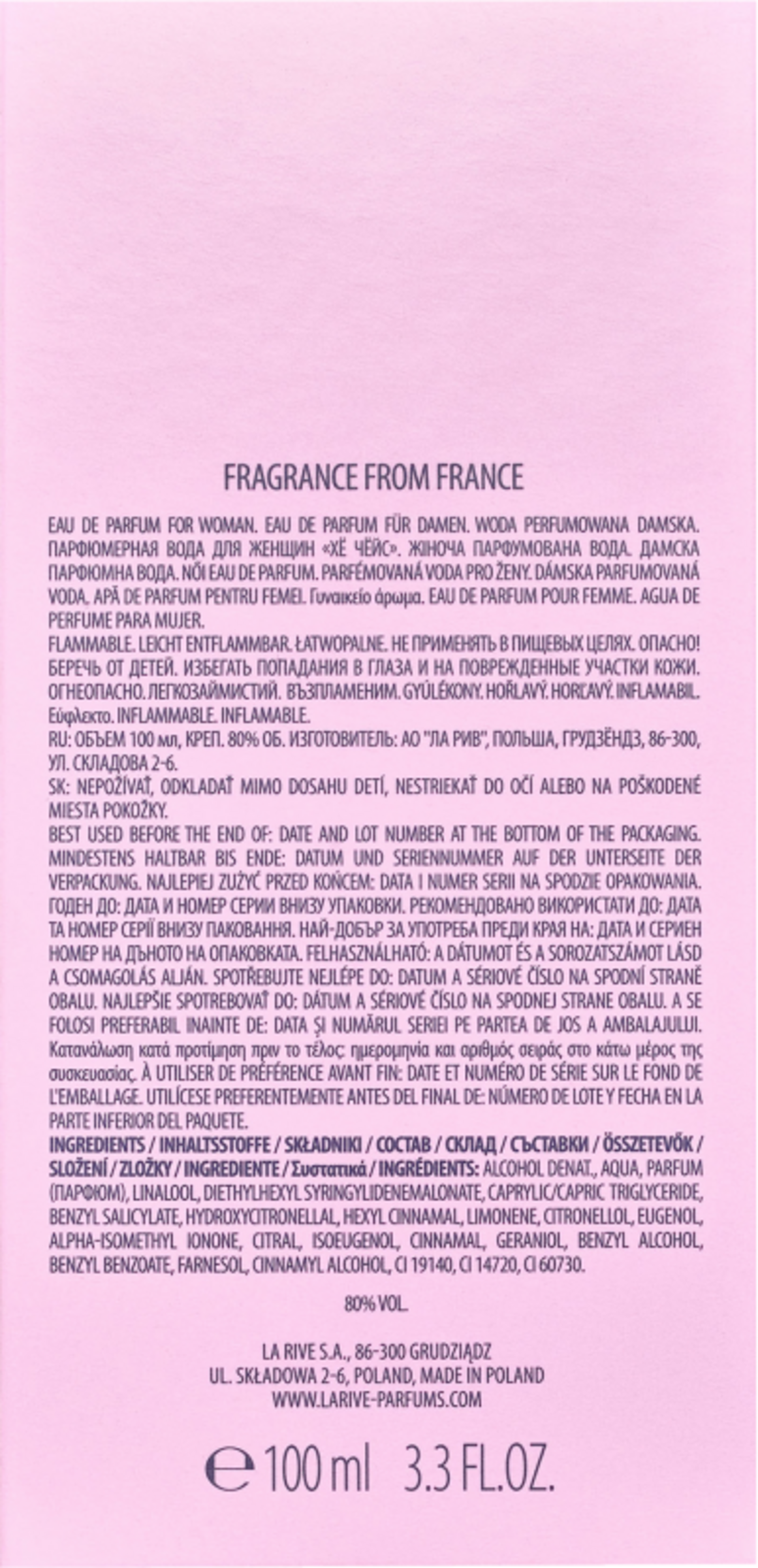 Alcohol Denat., Aqua, Parfum (парфюм), Linalool, Diethylhexyl Syringylidenemalonate,, Caprylic/Capric Triglyceride, Benzyl Salicylate, Hydroxycitronellal, Hexyl Cinnamal, Limonene, Citronellol,Eugenol, Alpha – Isomethyl Ionone, Citral, Isoeugenol, Cinnamal, Geraniol, Benzyl Alcohol, Benzyl Benzoate, Farnesol, Cinnamyl Alcohol, CI 19140, , CI 14720,, CI 60730.