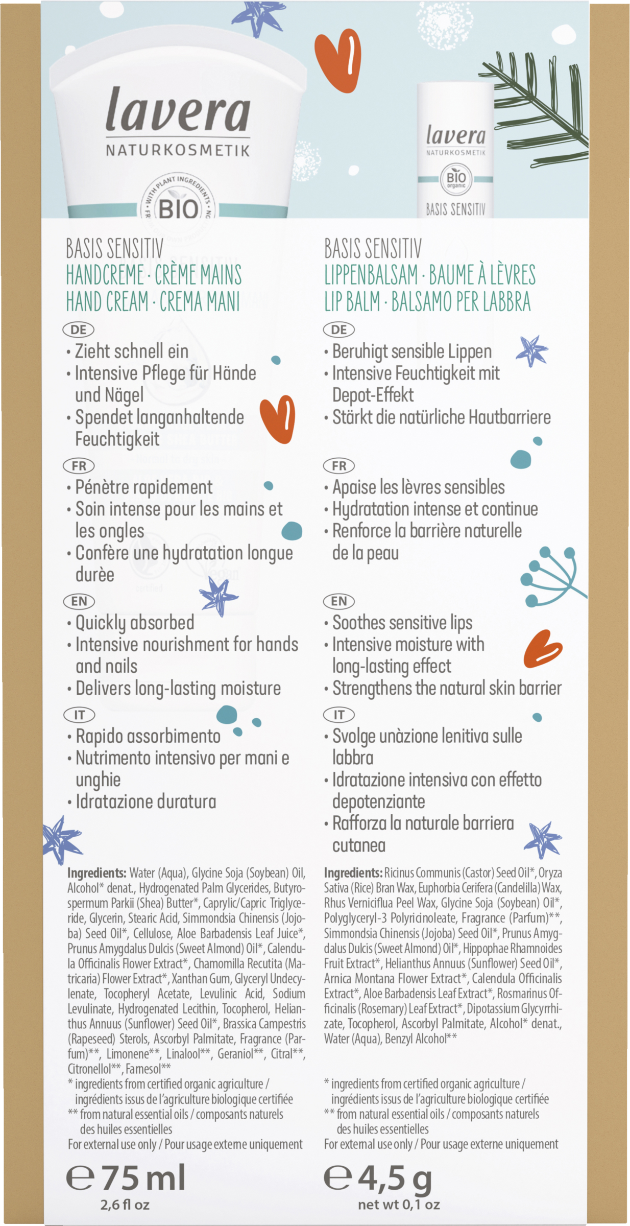 Oplev lavera følelsen af intensivt plejede hænder og læber med en frisk basis sensitiv duft i en flot julegaveæske, der består af en basis sensitiv læbebalsam og en basis sensitiv håndcreme. Basis Læbebalsam Sensitive med økologisk jojobaolie og økologisk mandelolie plejer blidt tørre og sensitive læber. Den fløjlsbløde læbebalsam danner en langvarig, naturlig beskyttelsesfilm på huden, forhindrer den i at tørre ud og efterlader læberne bløde og smidige.