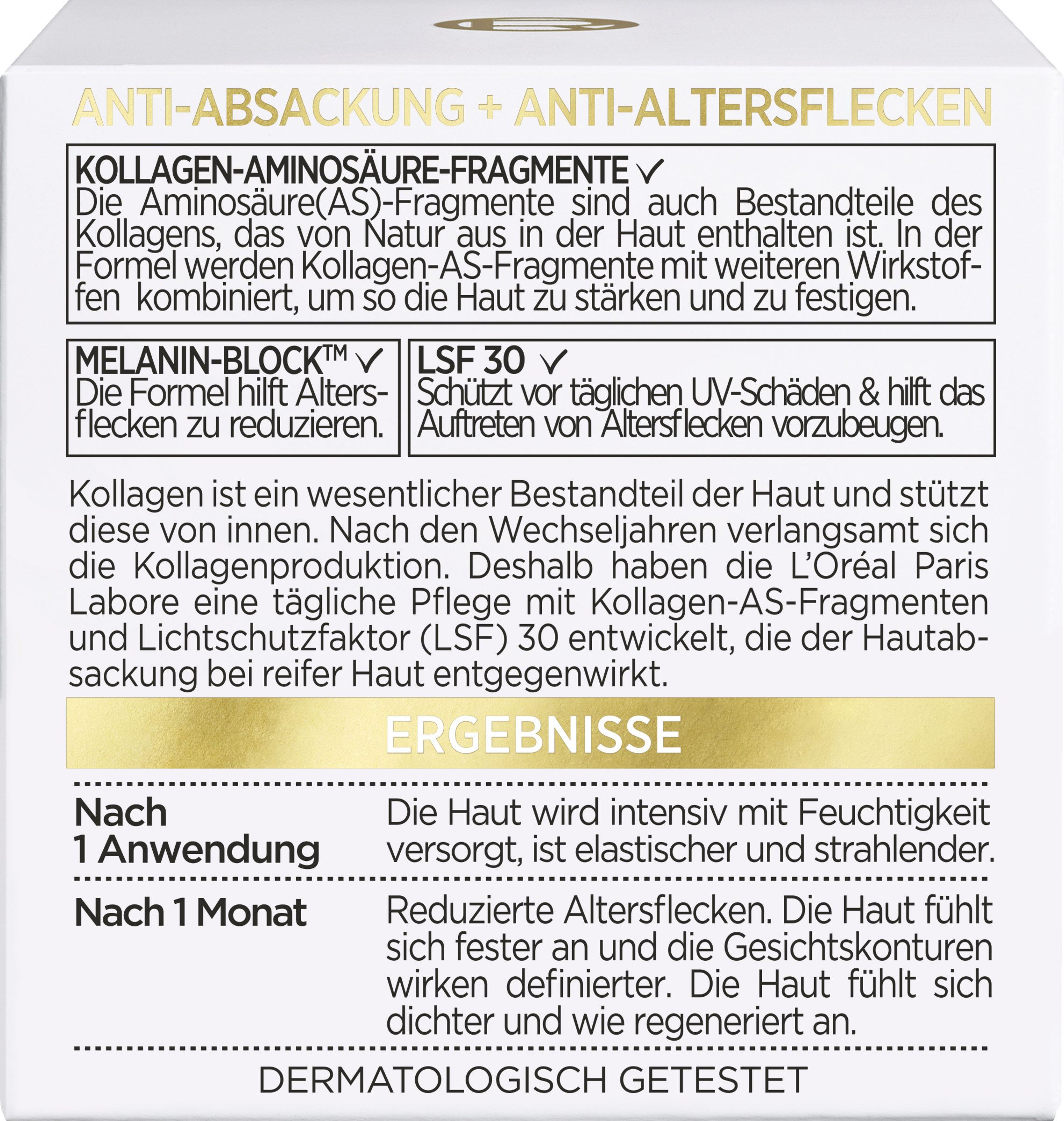 Den opstrammende dagpleje Age Perfect Pro-Collagen Expert imponerer med sin anti-sagging + anti-age-spot effekt. Aminosyrefragmenterne (AS) er også en del af kollagen, som findes naturligt i huden. Kollagen er en vigtig bestanddel af huden og støtter den indefra. Kollagenproduktionen bliver langsommere efter overgangsalderen. Formlen kombinerer kollagen AS-fragmenter med andre aktive ingredienser for at styrke og opstramme huden. Melaninblokken hjælper med at reducere alderspletter. Solbeskyttelsesfaktor 30 beskytter mod daglige UV-skader og hjælper med at forebygge alderspletter.