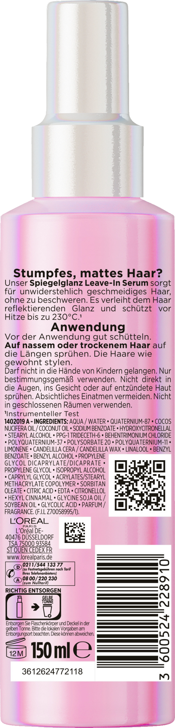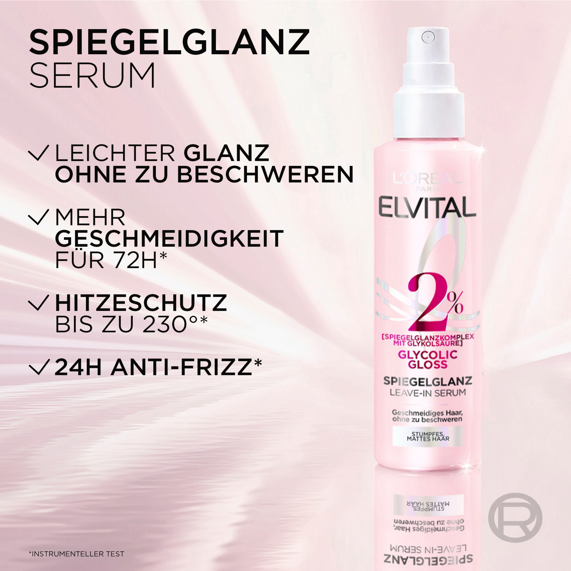 Elvital Glycolic Gloss Leave-in Serum er en del af hårplejeserien Elvital Glycolic Gloss fra L'Oréal Paris. Ligesom shampoo og balsam indeholder serummet også glykolsyre. Formlen med 2% mirror shine complex med glykolsyre udglatter skællaget og giver dit hår en spejlblank effekt. Samtidig giver den varmebeskyttelse op til 230 °C og modvirker krus i 24 timer. Desuden giver leave-in-serummet næring til håret i op til 72 timer uden at tynge det ned. Brugt i kombination giver shampoo, balsam og leave-in mere glans og smidighed fra den allerførste påføring. Serummet har også en overbevisende duft: Den frugtagtige blomsterkomposition begynder med grapefrugt i topnoten, fortsætter med jasmin i hjertenoten og slutter med cedertræ i basenoten.