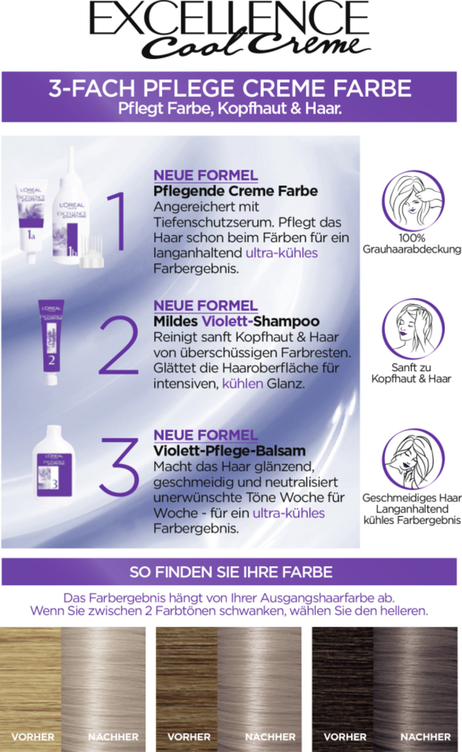 L'Oréal Paris har udviklet Excellence Cool Creme Nuancer, som garanterer en ultra-kølig tone takket være den innovative Violett-formel. Violette farvestoffer modvirker varme toner, som kan opstå ved farvning. Den nye violette plejerutine giver et langtidsholdbart køligt farveresultat, selv efter farvning. Den milde Violett-shampoo renser forsigtigt hovedbunden og håret for overskydende farverester og glatter hårets overflade ud, så det får en intensiv, kølig glans. Den righoldige pleje balsam neutraliserer uønskede farvetoner og holder farveresultatet køligt.