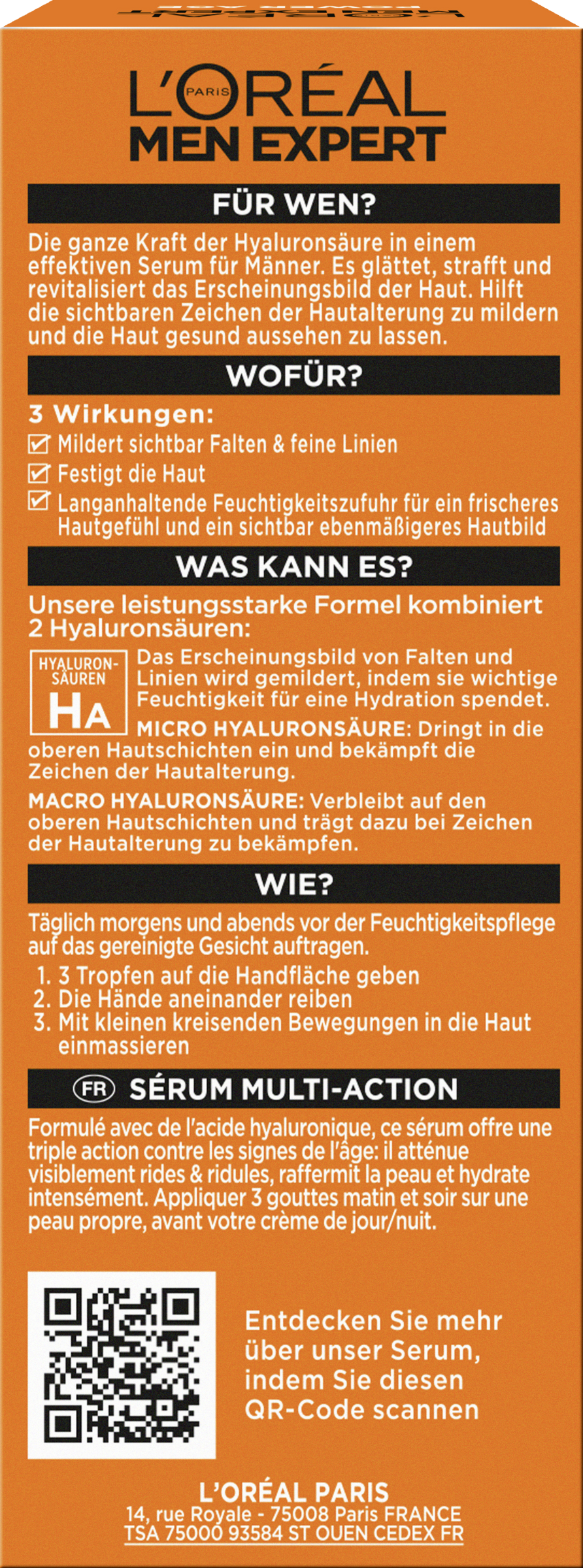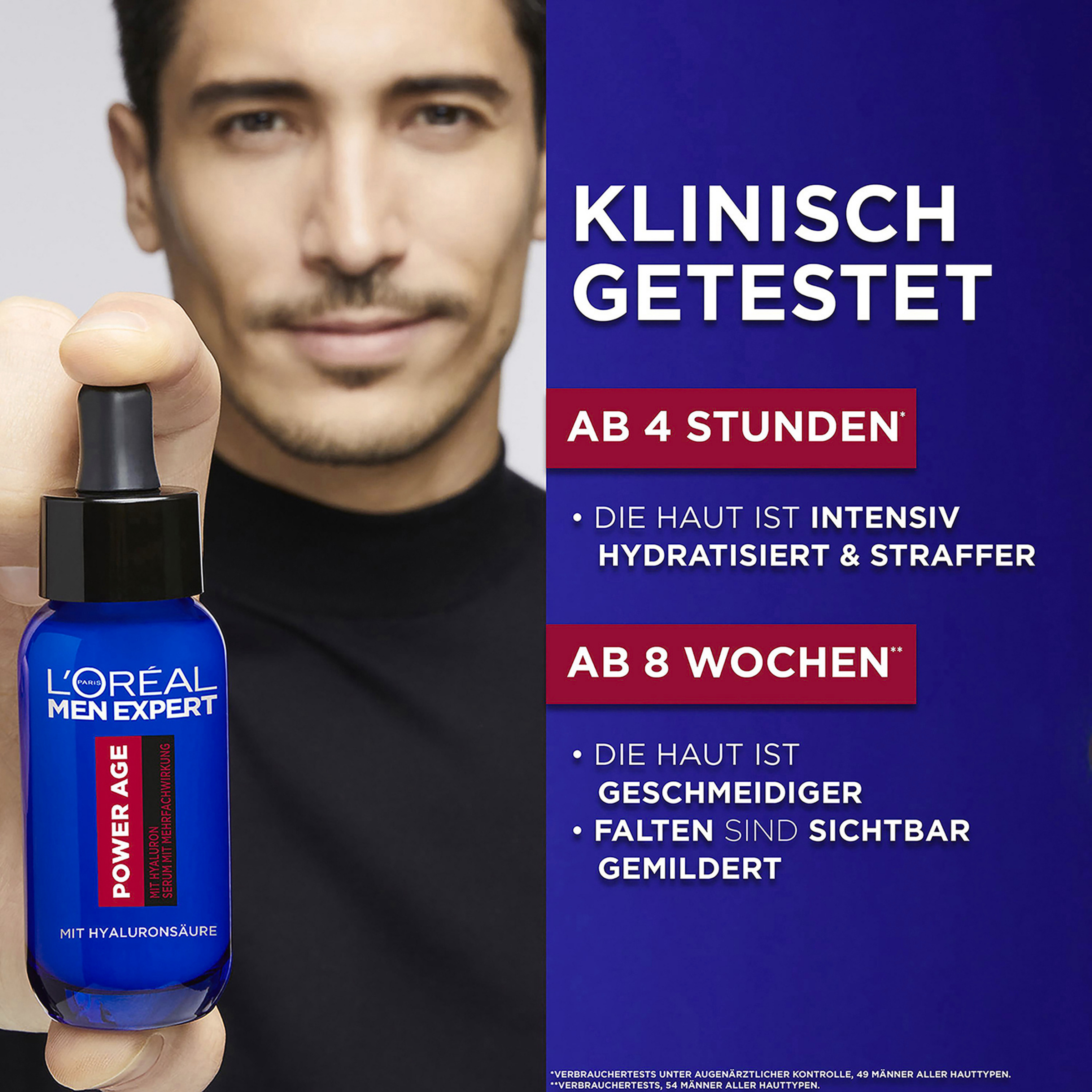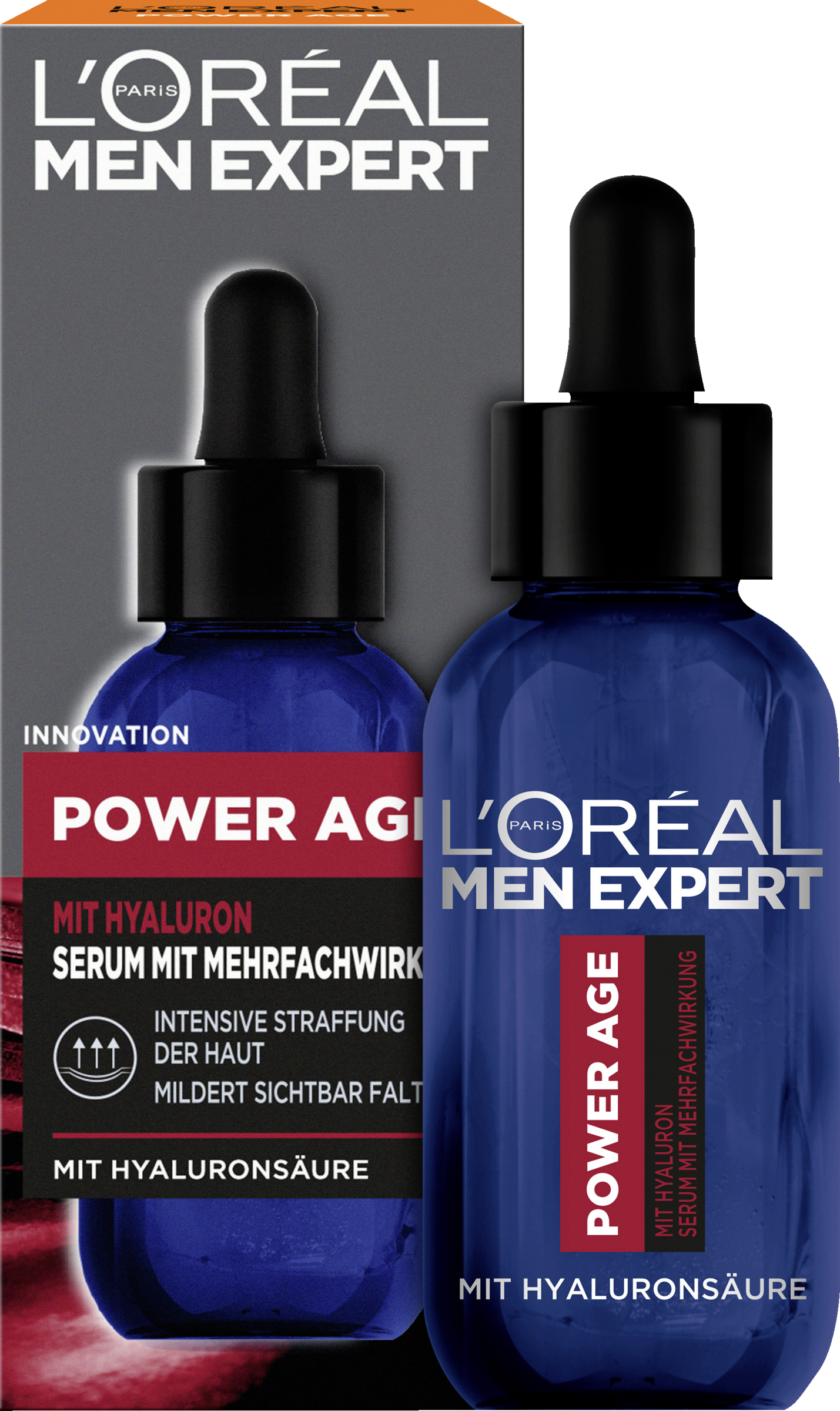 Power Age Serum fra L'Oréal Paris Men Expert er et effektivt ansigtsplejeprodukt til mænd, der bruger hyaluronsyrens kraft til at udglatte, opstramme og revitalisere mænds hud. Den kraftfulde formel med 2 hyaluronsyrer reducerer synligt rynker og fine linjer, opstrammer huden og giver langvarig fugt. Serummet er testet under dermatologisk overvågning og kan anvendes på et renset ansigt hver morgen og aften før fugtighed. Power Age Serum fra L'Oréal Paris Men Expert giver mænd en intensiv opstramning af huden og en frisk følelse.