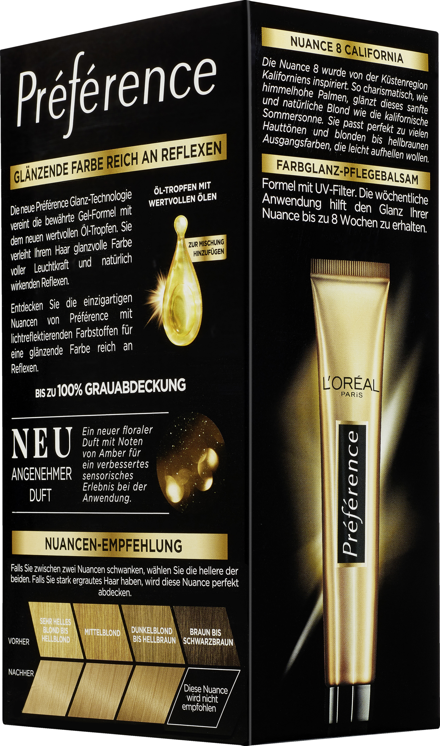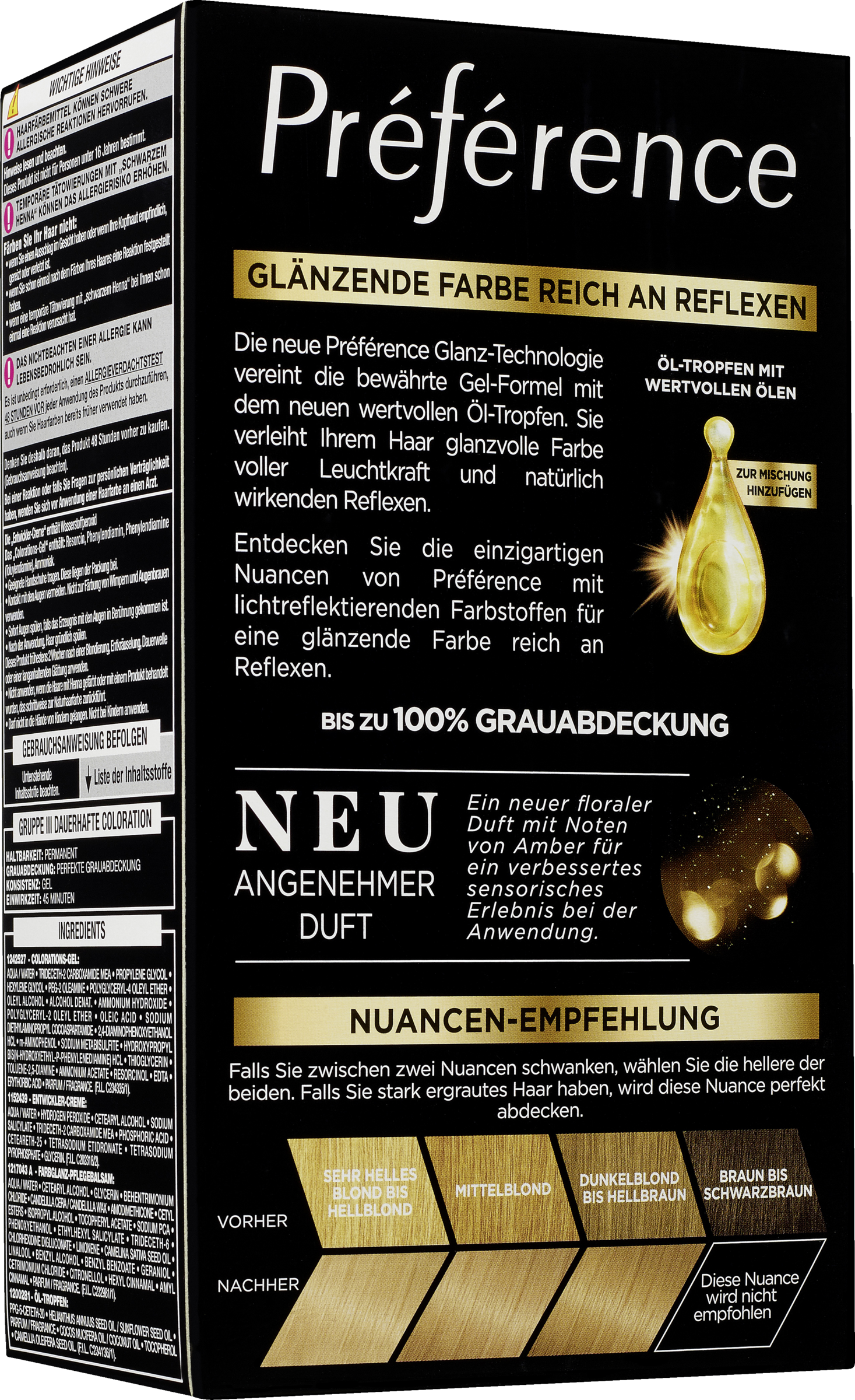 Den nye Préférence Glanz-teknologi forener den gennemtestede gelformel med de nye nærende oliedråber. Den giver dit hår glansfuld farve og naturligt virkende refleksioner. Opdag Préférences enestående nuancer med lysreflekterende farvestoffer til en skinnende farve rig på refleksioner.
