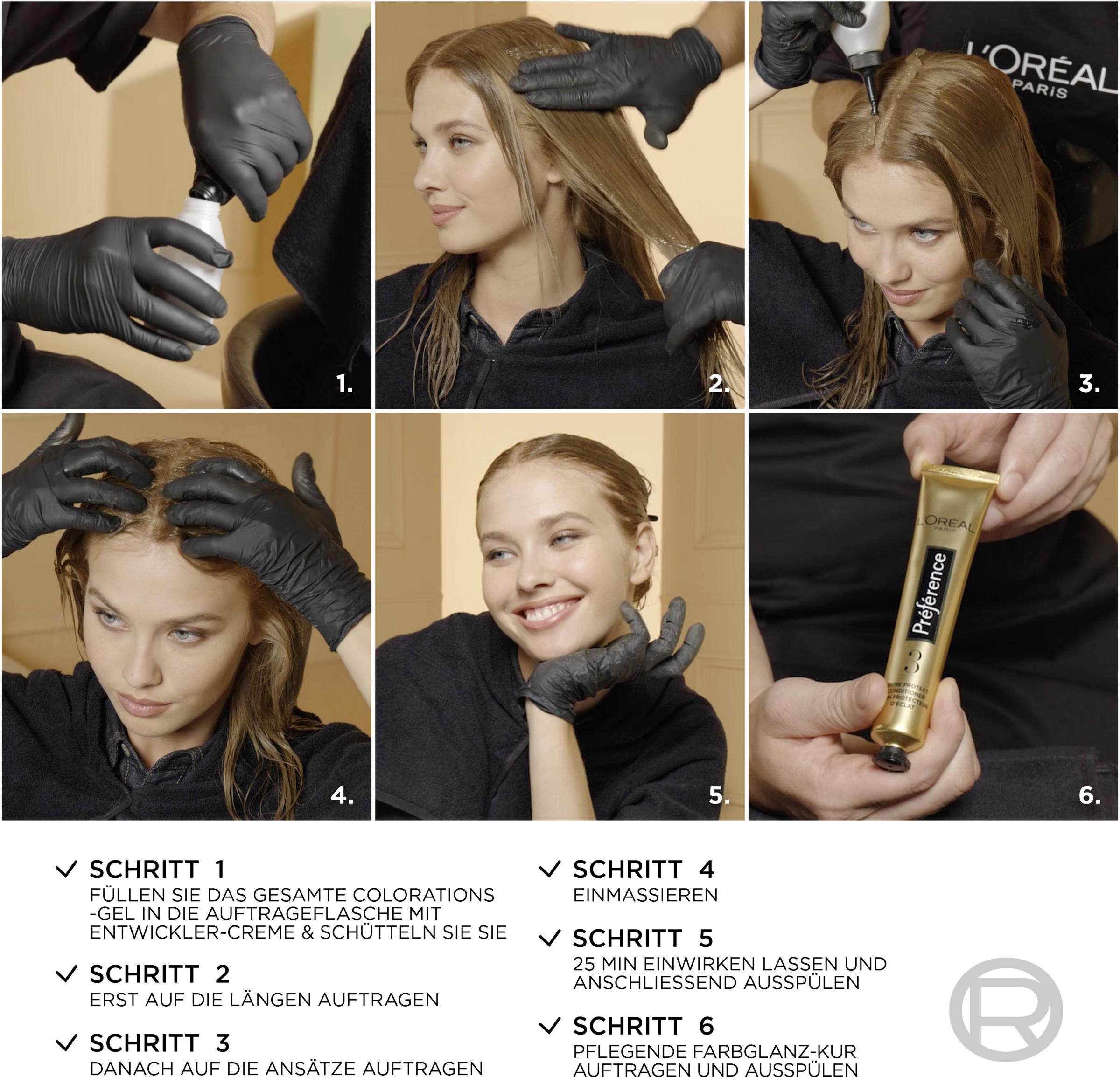 Forberedelse: Læs altid den medfølgende brugsanvisning omhyggeligt. Farvelægning: Når du skal farve dit hår, hælder du gelen og glansen i fremkalderflasken og ryster blandingen godt. Påfør nu produktet på rødderne, og massér det ind. Påfør den resterende gel i længderne og spidserne, og fordel den jævnt. Udskylning: Efter virketiden skal du skumme håret op med lidt lunkent vand og arbejde det forsigtigt ind. Skyl derefter grundigt, indtil vandet løber klart. Pleje Fordel plejebalsamen i vådt hår. Skyl derefter balsamen grundigt.