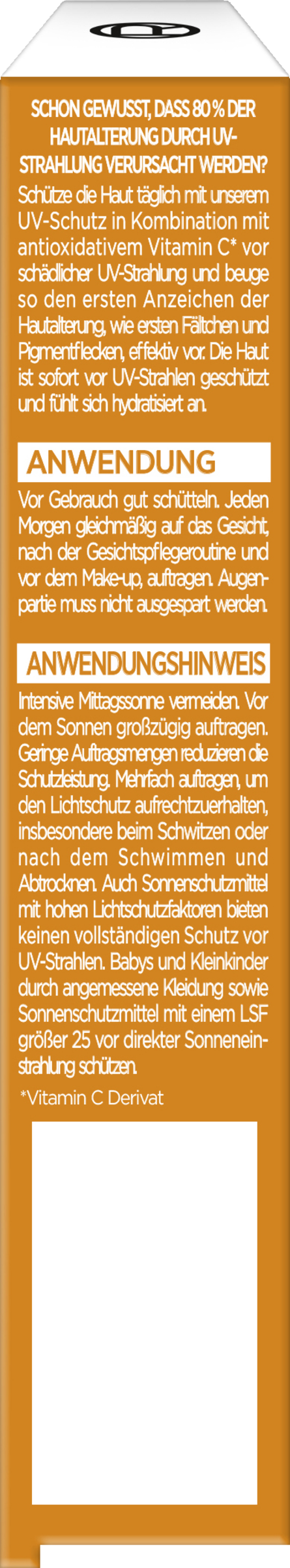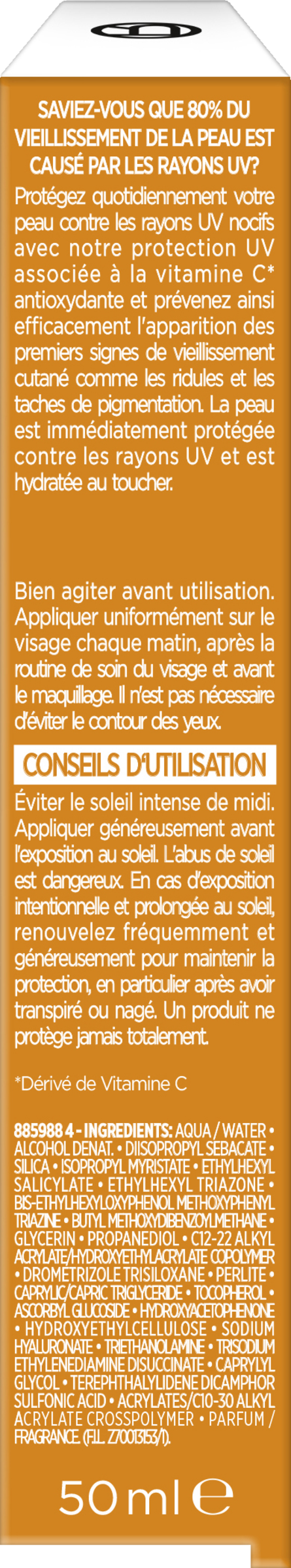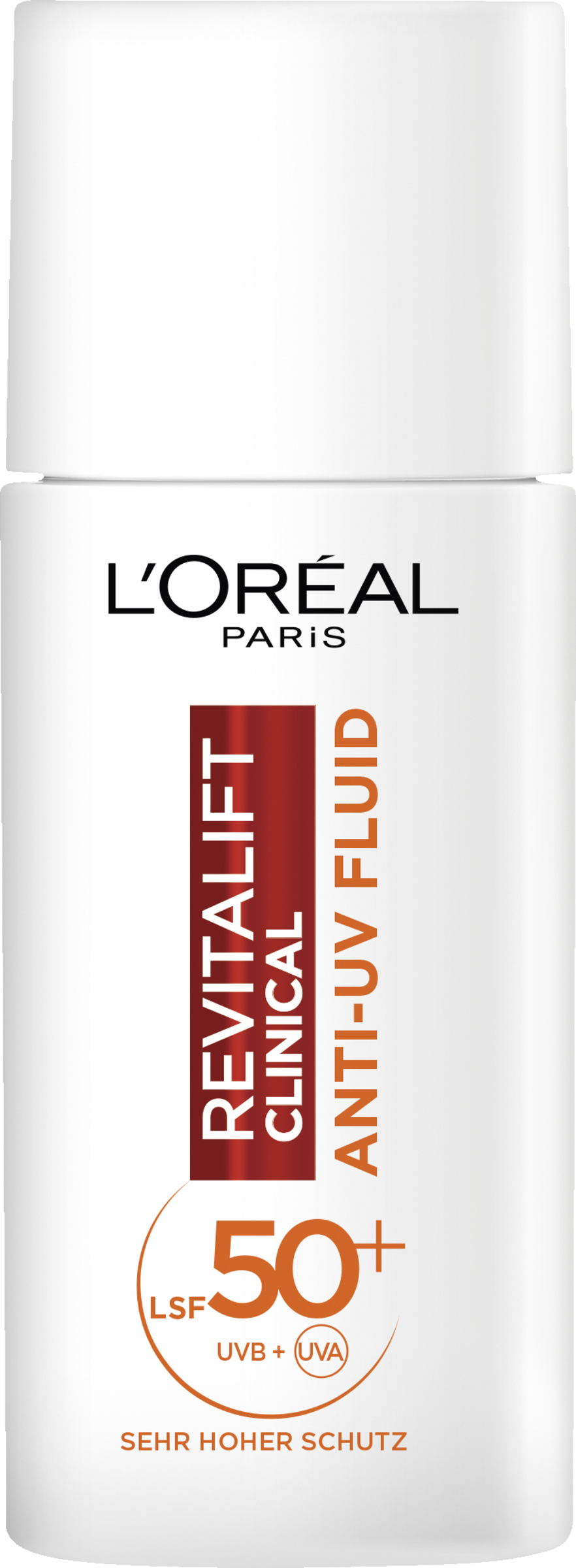 Revitalift Clinical C-vitamin Daily Anti-UV Fluid SPF 50+ fra L'Oréal Paris til daglig anvendelse er den mest innovative og avancerede UV-beskyttelse med C-vitamin. Den ultralette og fugtgivende væske beskytter huden dagligt mod skadelig UV-stråling med en solbeskyttelsesfaktor på 50+ og forhindrer dermed effektivt de første tegn på hudens aldring, såsom rynker og pigmentpletter. Anti-UV-væsken er sved- og vandafvisende og kan modstå miljøpåvirkninger. Derudover er teksturen af C-vitamin Ansigtspleje ultralet og ikke-klæbende. Væsken absorberes hurtigt, efterlader en usynlig Finish på alle hudtyper og er derfor ideel som Makeup base. Anti-aging væsken kan derfor påføres enten som en Fugtighedscreme eller efter din Hudpleje.