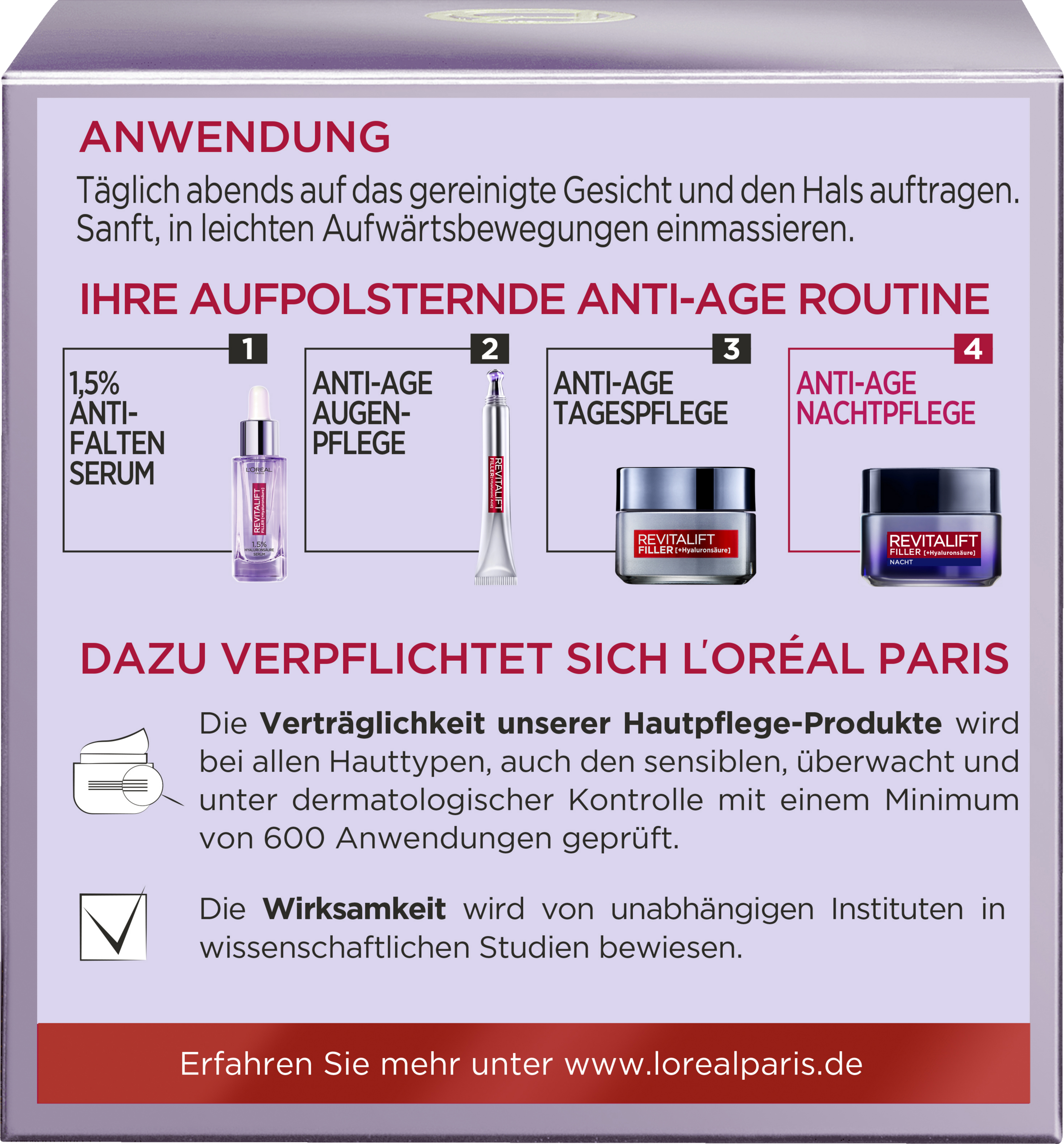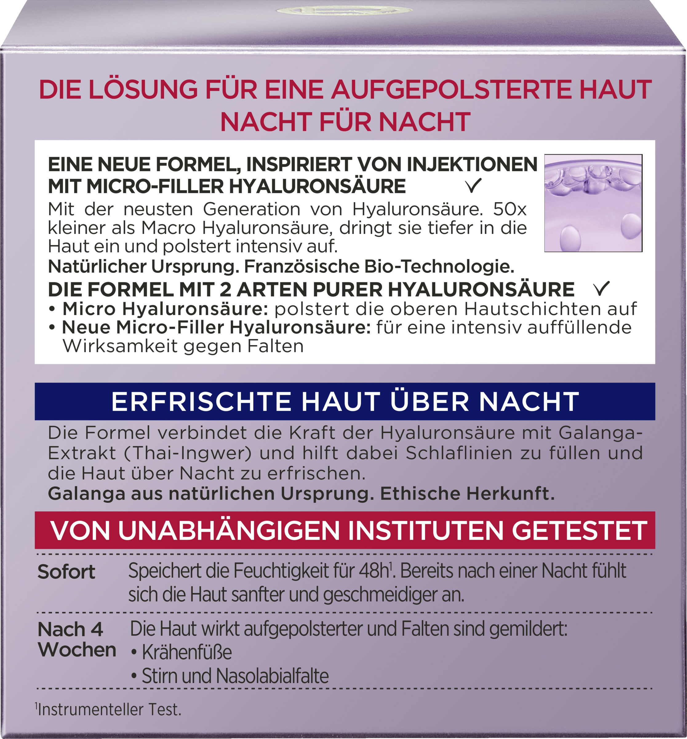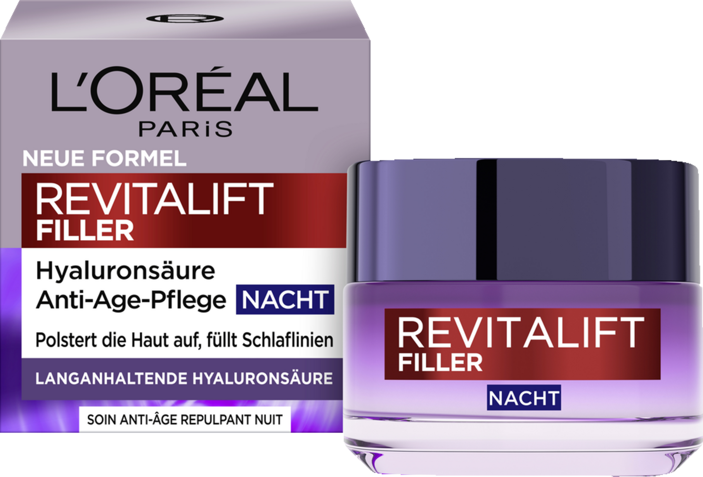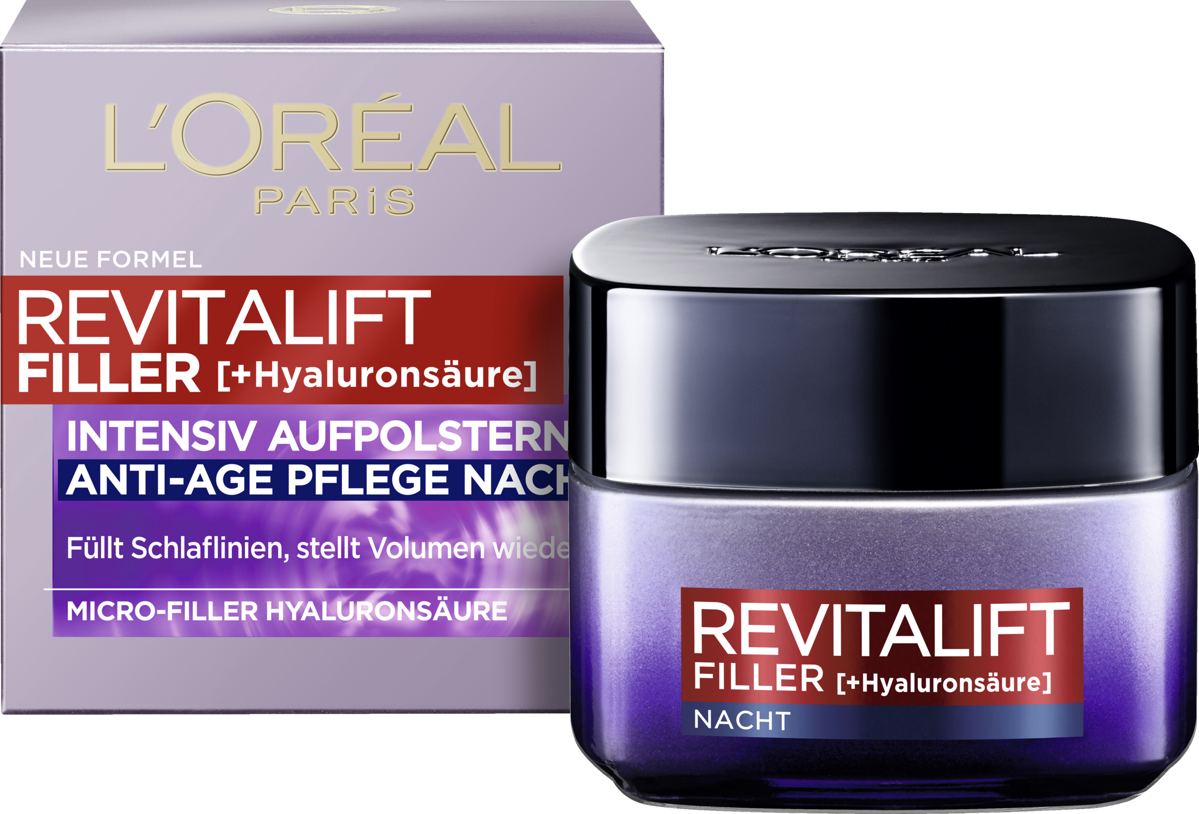 L'Oréal Paris Revitalift Filler [+Hyaluronic Acid] Intensive Plumping Anti-Age Night Care indeholder Micro-Filler Hyaluronic Acid, som er 50 gange mindre end Macro Hyaluronic Acid og derfor trænger dybere ned i huden og plumper den intensivt op. Huden er gennemfugtet og holder på fugten i 48 timer. Rynker reduceres, og huden fremstår udfyldt. Påføres om aftenen i det rensede ansigt og på halsen. Masseres omhyggeligt ind i lette opadgående bevægelser. For opstrammet og fugtet hud.