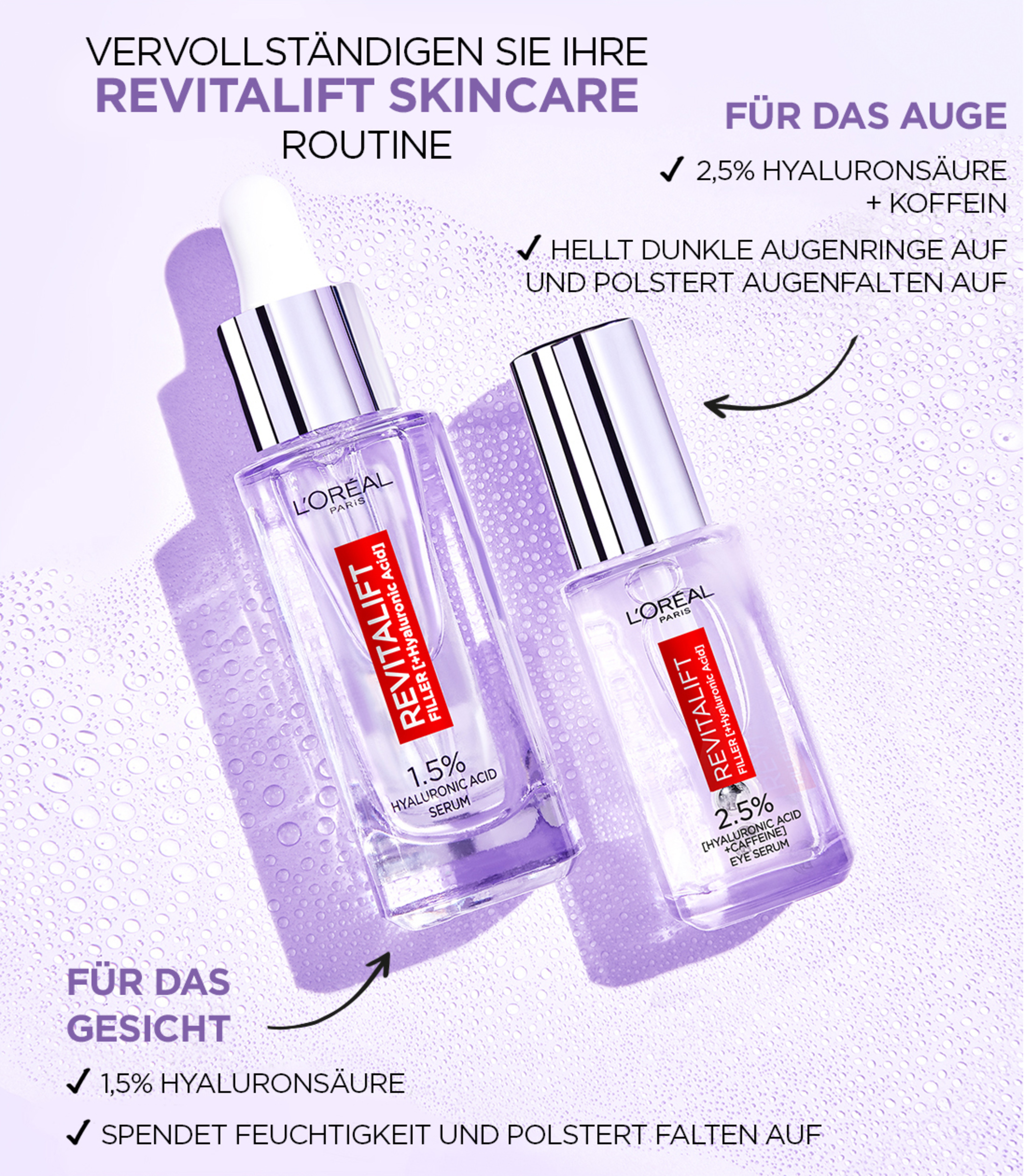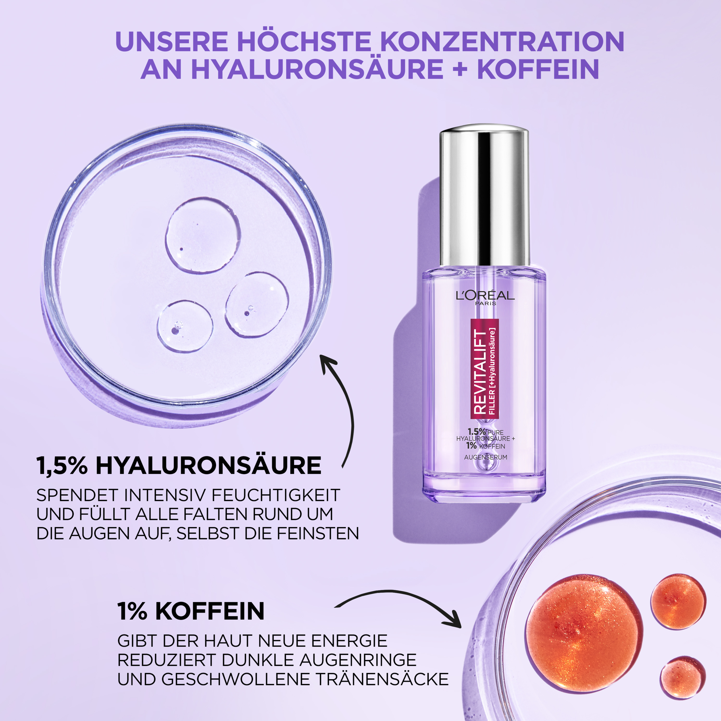 Det første Revitalift Filler Serum specielt til Øjne: Med 1,5 % Hyaluronsyre og 1 % koffein mindskes rynker og mørke rande under øjnene. Ren Hyaluronsyre giver følsom hud intensiv fugt og reducerer effektivt rynker. Ren koffein revitaliserer huden og reducerer mørke rande under øjnene og hævelser. Med 4% niacinamid lyses mørke rande under øjnene for en ungdommelig glød. Serummet kan påføres med den innovative triple ball applikator. Den fleksible applikator giver dig mulighed for at massere hele øjenområdet og skaber en øjeblikkelig kølende effekt. De 3 kugler i Rustfrit stål genopliver hævet og træt hud. Resultatet – yngre Øjne på 2 uger! Huden bliver straks intensivt hydreret, og trætte Øjne virker vågne. Efter 2 uger ses øjenrynker reduceret, og mørke rande under øjnene er reduceret. Efter 6 uger fremstår huden fastere. Fine linjer under Øjne reduceres.