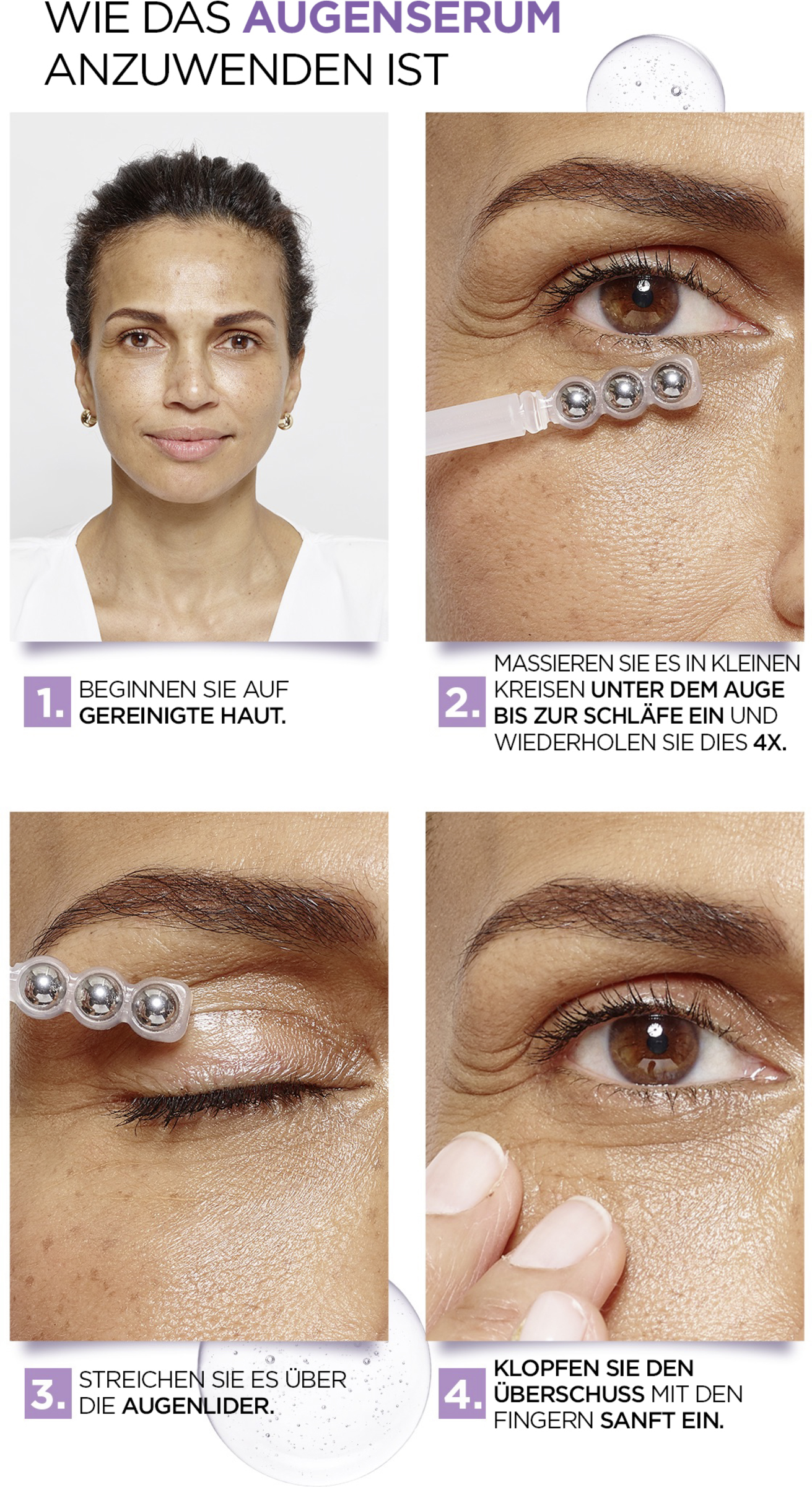 Påfør øjenserumet på det rensede øjenområde hver dag, morgen og aften. Massér den i cirkulære bevægelser ved hjælp af applikatoren fra den indre til den ydre øjenkrog. Gentag dette 4 gange. Påfør det derefter på øjenlågene og øjenkonturerne. For at forbinde skal du trykke let på de 6 energigivende punkter omkring øjenområdet. Masser blidt ind overskydende serum med fingrene og fortsæt med din daglige Plejerutine .