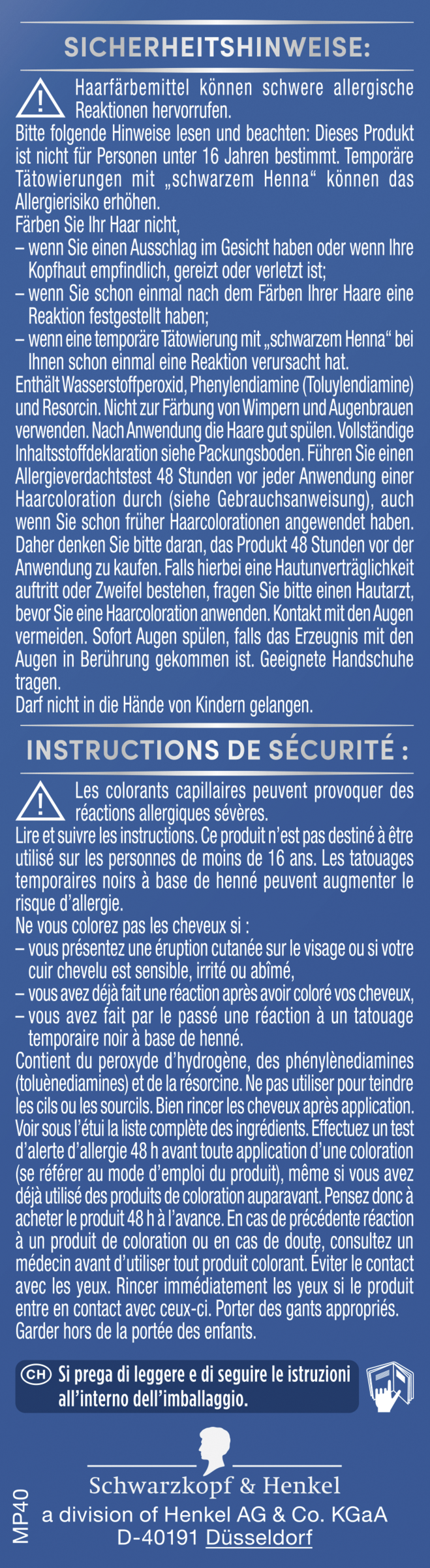 SIKKERHEDSANVISNINGER: Hårfarvemidler kan forårsage alvorlige allergiske reaktioner. Læs og overhold følgende anvisninger: Dette produkt er ikke beregnet til personer under 16 år. Midlertidige tatoveringer med "sort henna" kan øge allergirisikoen. Undlad at farve dit hår – hvis du har udslæt i ansigtet, eller hvis din hovedbund er følsom, irriteret eller skadet – hvis du allerede har fastslået en reaktion efter at have farvet dit hår – hvis en midlertidig tatovering med "sort henna" allerede har forårsaget en reaktion hos dig. Indeholder brintoverilte og phenylendiamin (toluylendiamin). Fuldstændig inholdsstofdeklaration fremgår af bunden af emballagen. Undgå kontakt med øjnene. Skyl straks øjnene, hvis produktet kommer i kontakt med øjnene. Må ikke bruges til farvning af vipper og øjenbryn.