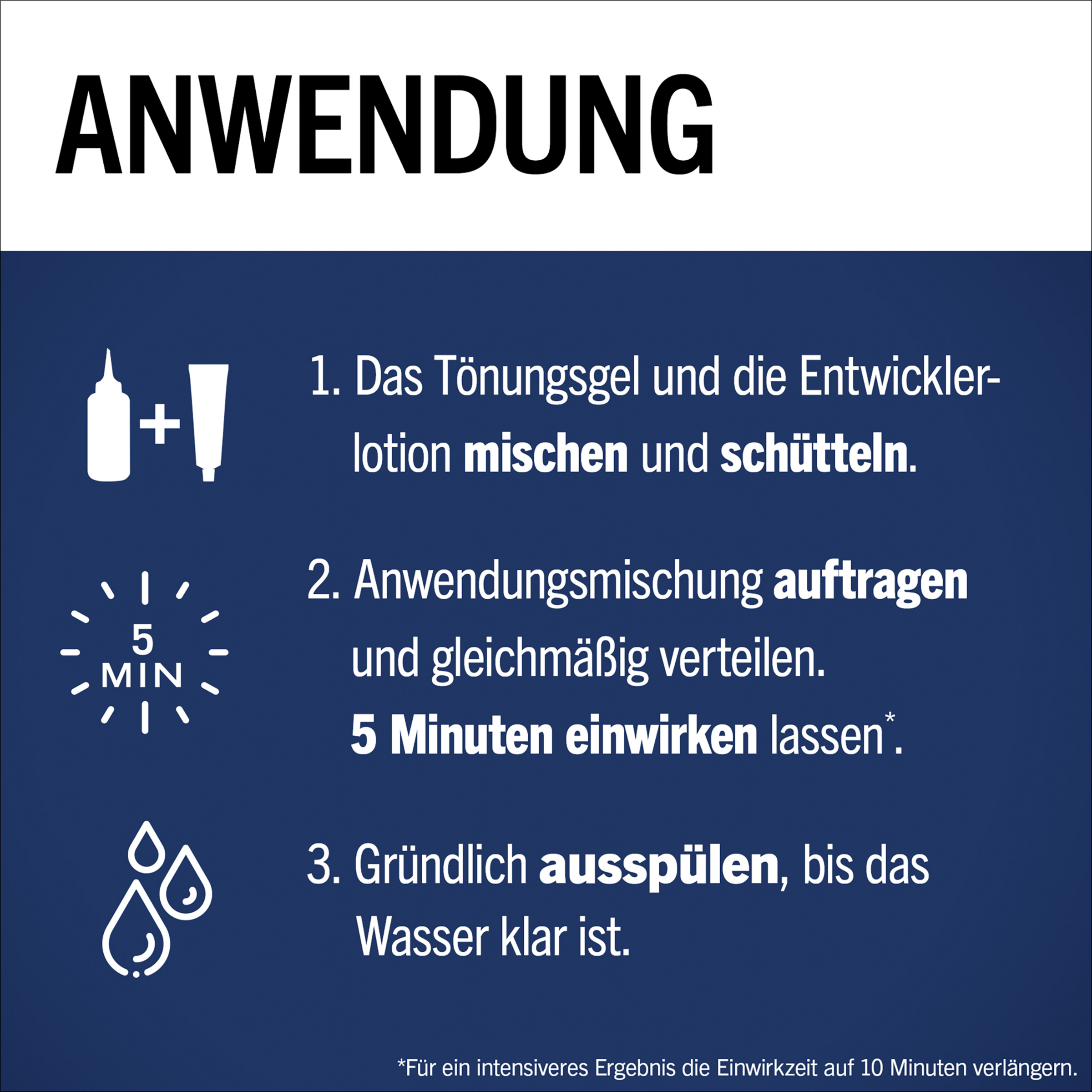 Bland toningsgelen med fremkalderen, og omryst flasken kraftigt, påfør toningsgelen i håret med speed-applikatoren, og skyl gelen ud igen efter 5-10 minutter