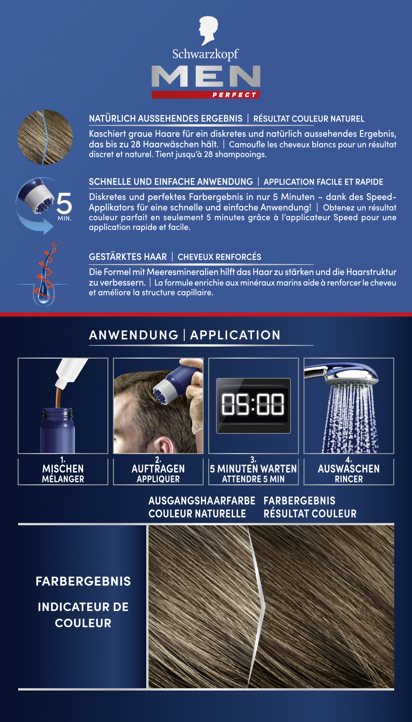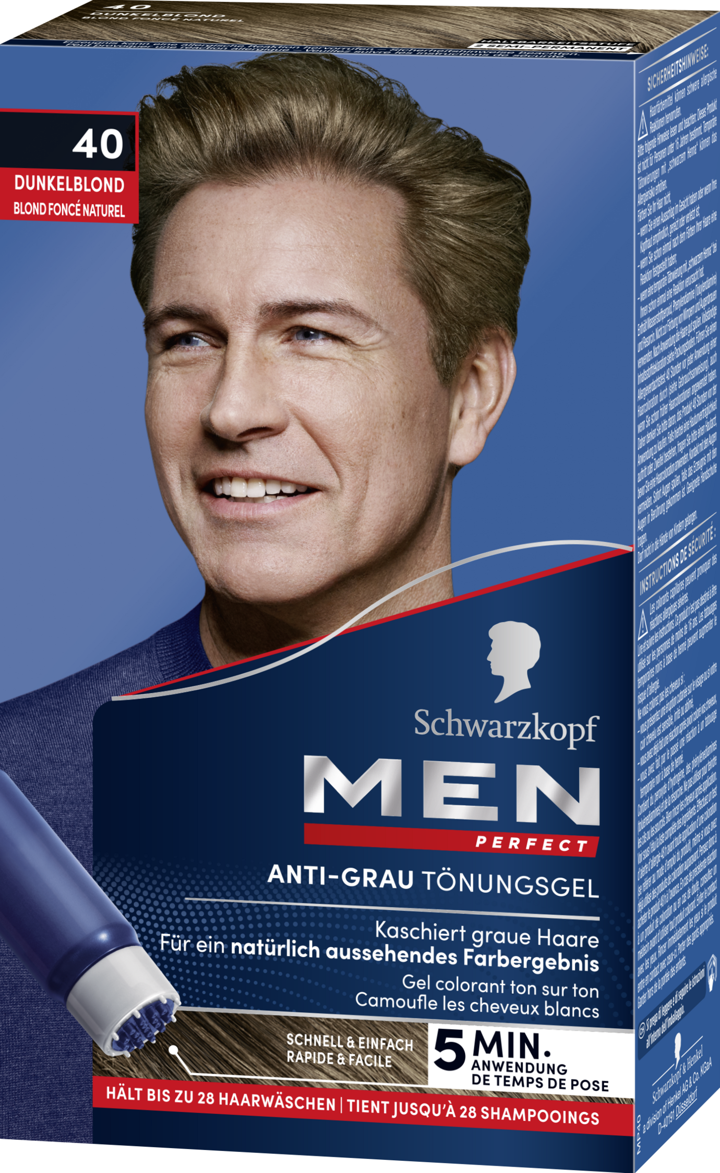 MEN PERFECT er en mild, brugervenlig gel-farvning, som blænder dit grå hår ud for at give dig en diskret, naturligt udseende hårfarve. Ved anvendelse med Schwarzkopfs patenterede speed-applikator frisker formlen din hårfarve op og styrker håret. Holder til op til 28 hårvaske.