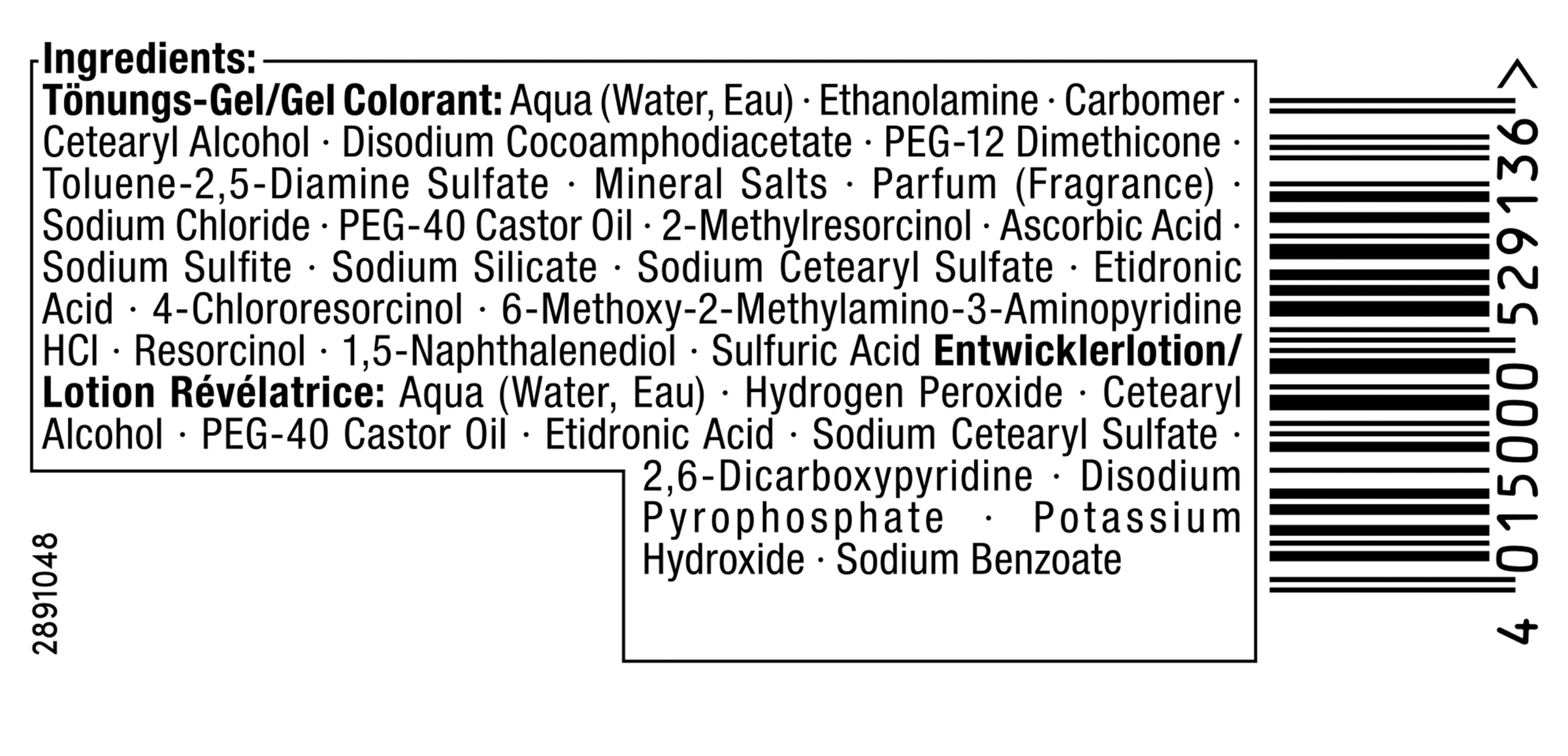Entwicklerlotion: Aqua (Water, Eau), Hydrogen Peroxide, Cetearyl Alcohol, PEG-40 Castor Oil, Etidronic Acid, Sodium Cetearyl Sulfate, 2,6-Dicarboxypyridine, Disodium Pyrophosphate, Potassium Hydroxide, Sodium Benzoate.