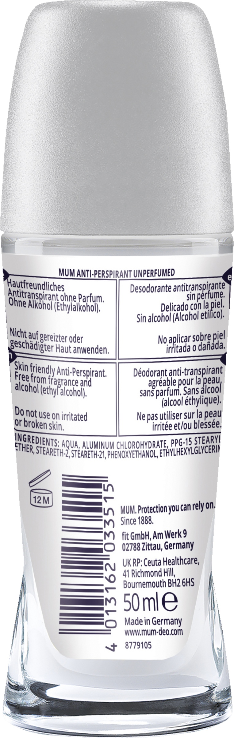 Roll-on antiperspiranten forhindrer effektivt overdreven sved og ubehagelig kropslugt. Den gode hudvenlighed og den langvarige effekt (48 timer+) er blevet bekræftet af eksperterne fra det uafhængige Schrader Institute. Mum Unperfumed beviser, at pålidelig og langvarig beskyttelse også er mulig uden duftstoffer. Det glæder både allergikere og parfume-elskere, for med Mum Unperfumed er udvalget af egnede parfumer ubegrænset.