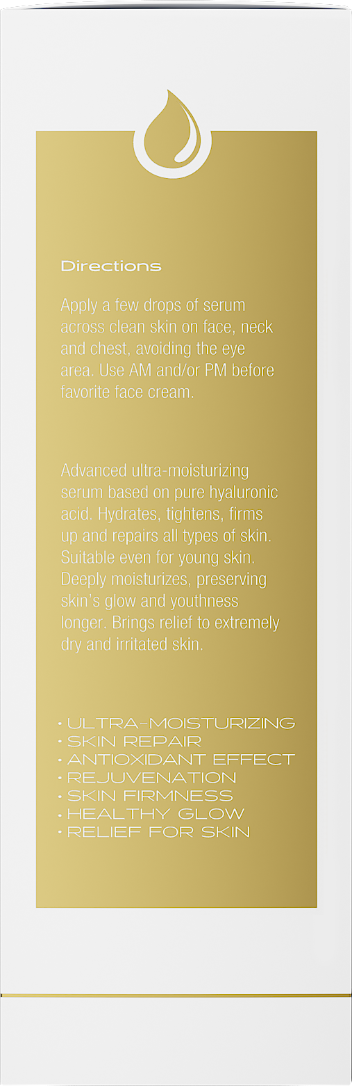 - LAVMOLEKYLÆR HYALURONSYRE – mikromolekyler af værdifuld hyaluronsyre trænger ned i de dybe hudlag, sikrer det rette fugtniveau i huden, lindrer tør og irriteret hud og giver dig et strålende og ungdommeligt udseende.