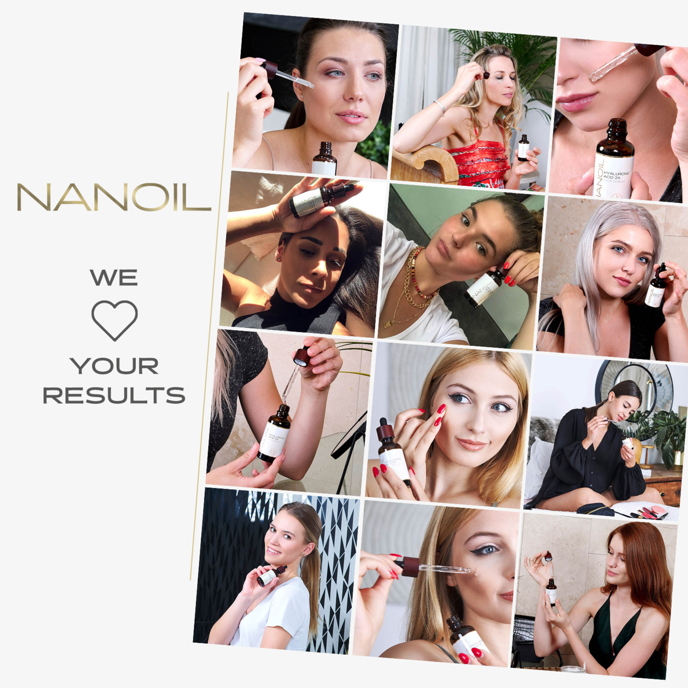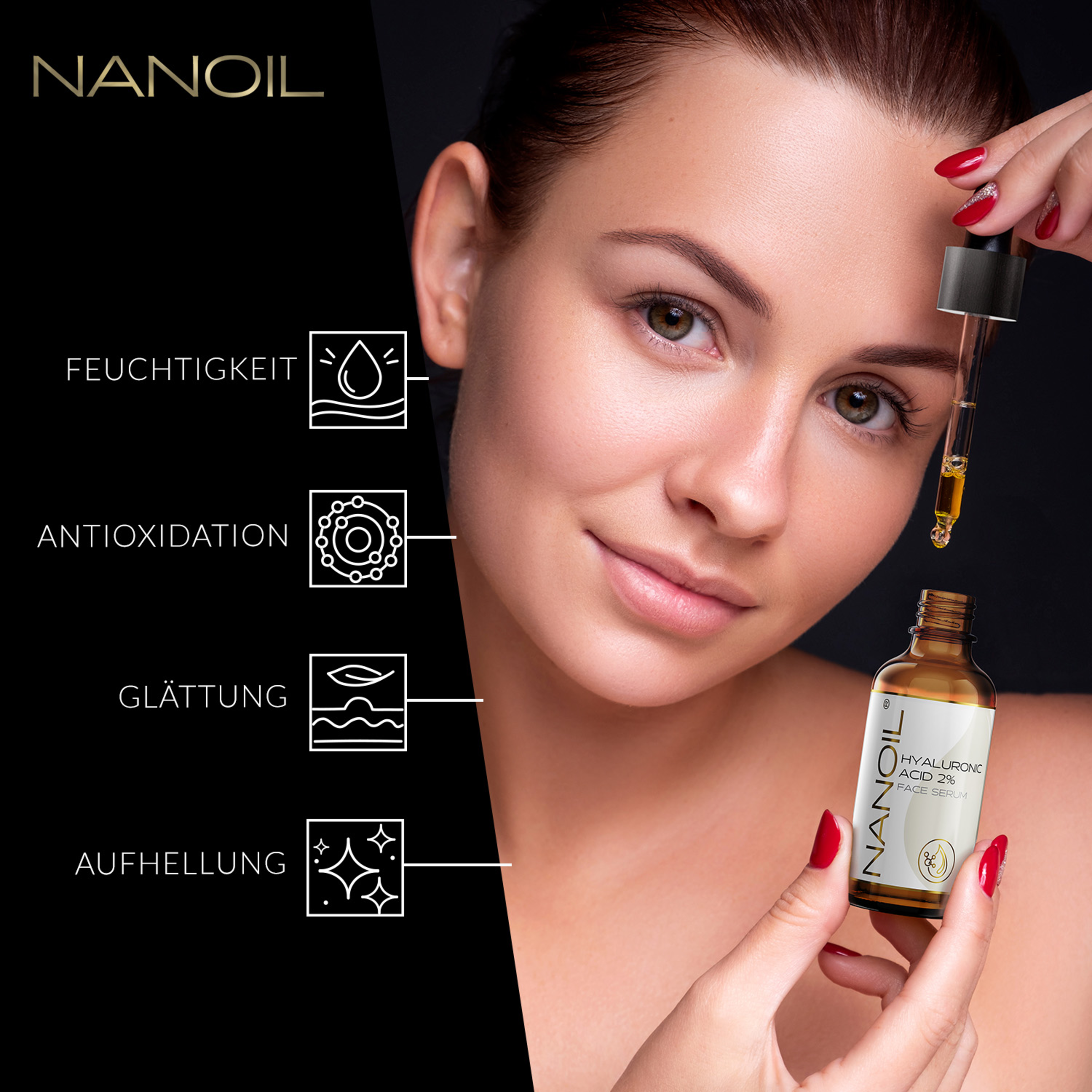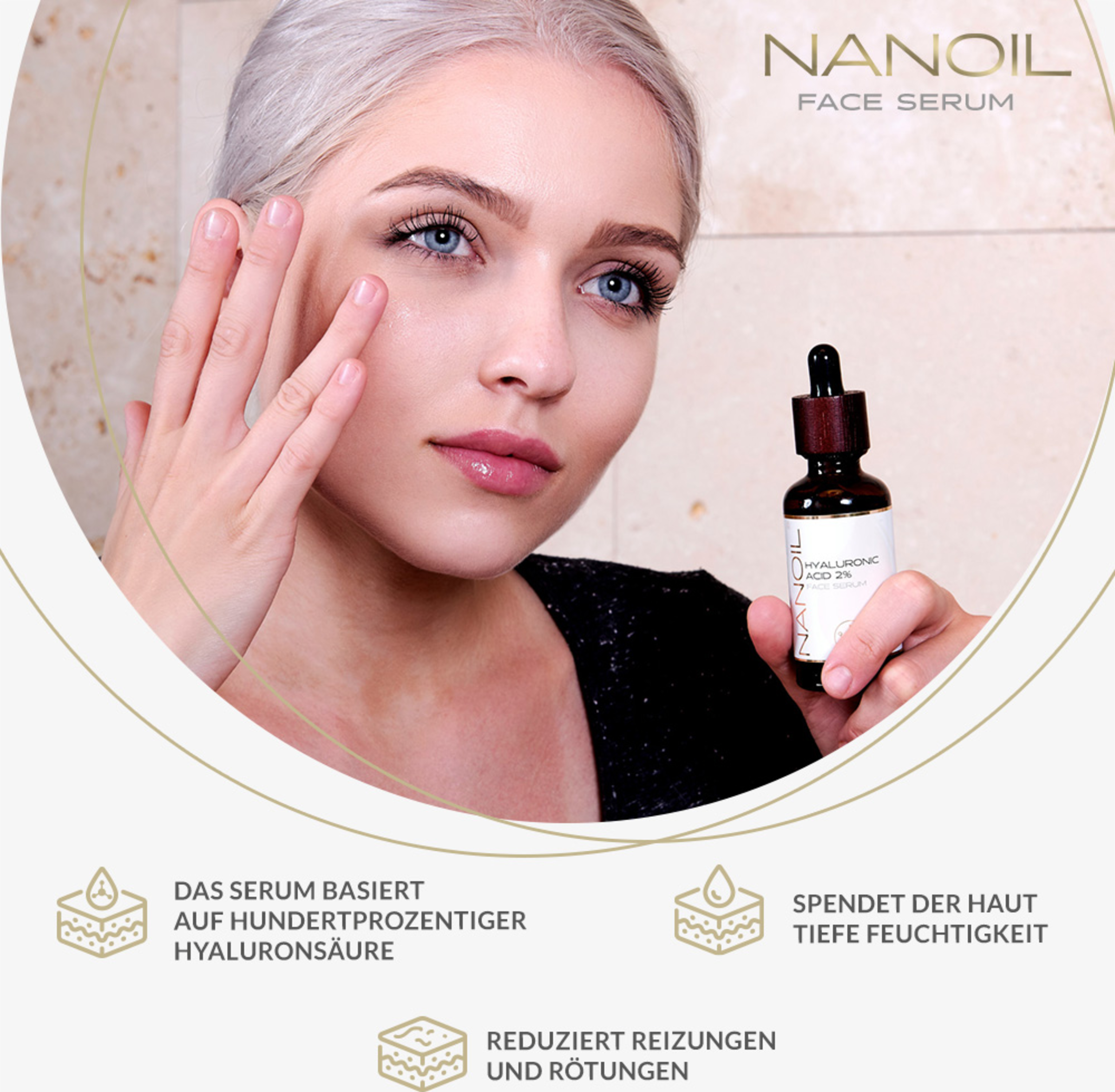 NANOIL ansigtsserum med hyaluronsyre – fugtgivende eliksir for en fejlfri teint Det fugtgivende ansigtsserum fra Nanoil indeholder ingredienser af høj kvalitet, der giver din ansigtshud en professionel behandling derhjemme og plejer den alsidigt: