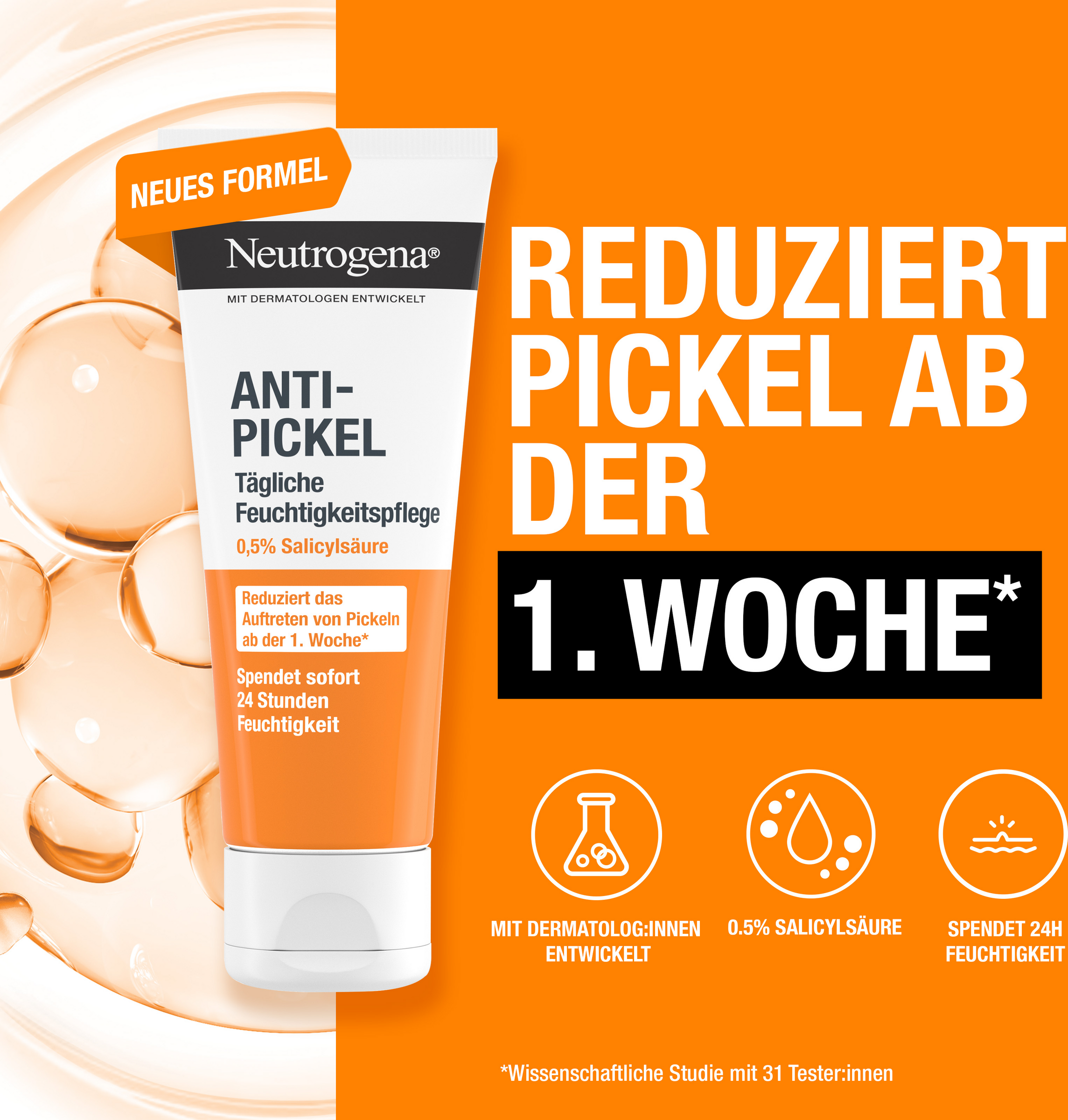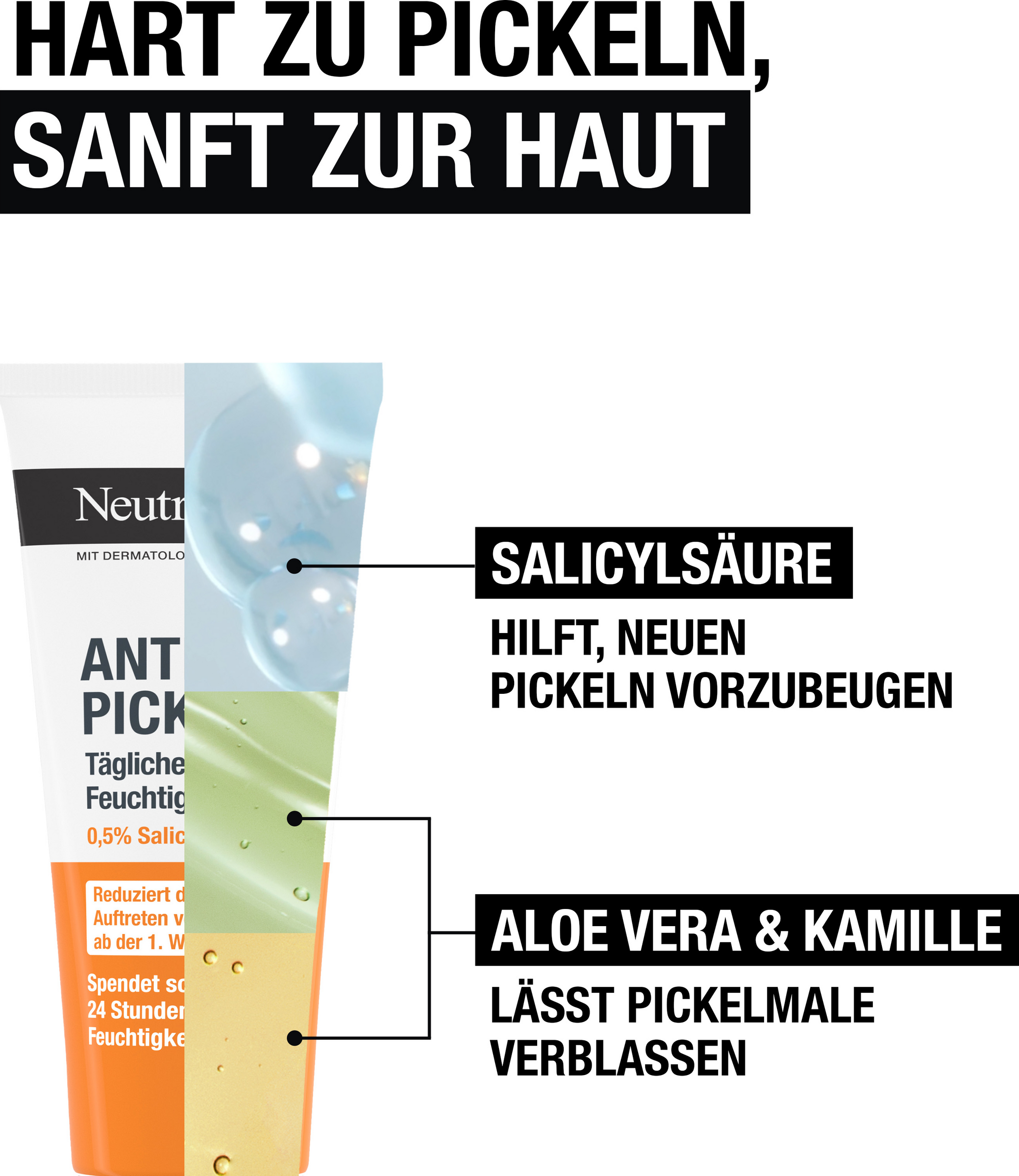 - Neutrogena Anti-Pickel Tägliche Feuchtigkeitspflege: Aqua, Glycerin, Propylene Glycol, Cetyl Alcohol, 012-15 Alkyl Benzoate, Glyceryl Stearate, PEG-100 Stearate, Stearyl Alcohol, C12-15 Alkyl Lactate, Dicaprylyl Ether, Aloe Barbadensis Leaf Extract, Chamomilla Recutita Extract, Cocamidopropyl PG-Dimonium Chloride Phosphate, Salicylic Acid, Menthyl Lactate, Cetyl Lactate, Dimethicone, Propylene Glycol Isostearate, Sodium Isostearoyl Lactylate, Palmitic Acid, Stearic Acid, Acrylates/Cl 0-30 Alkyl Acrylate Crosspolymer, Carbomer, Sodium Chloride, Disodium EDTA, Sodium Hydroxide, Benzalkonium Chloride, Phenoxyethanol, Ethylparaben, Methylparaben, Propylparaben, Parfum, Benzyl Alcohol [PR-0001035].