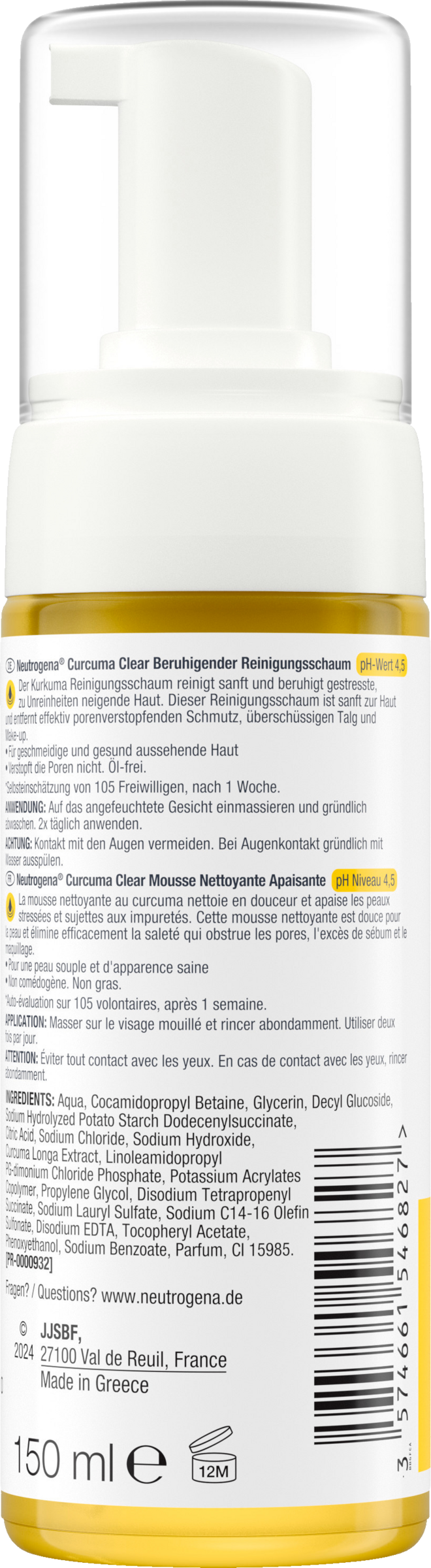 Skånsom ansigtsrensning med gurkemeje: Neutrogena Curcuma Clear Soothing Cleansing Foam renser blidt og beroliger stresset, uren hud og er udviklet i samarbejde med dermatologer. Den milde og oliefri ansigtsrens med gurkemeje renser skånsomt og effektivt. 94% bekræfter, at deres hud er grundigt renset*. Den blide renseskum til ansigtet i det nye design sikrer en glat og sund hud, selv for uren og følsom hud, uden at udtørre huden. Med en pH-værdi på 4,5 er renseskummet også skånsomt mod huden, tilstopper ikke porerne og fjerner effektivt poretilstoppende snavs, overskydende talg og makeup.