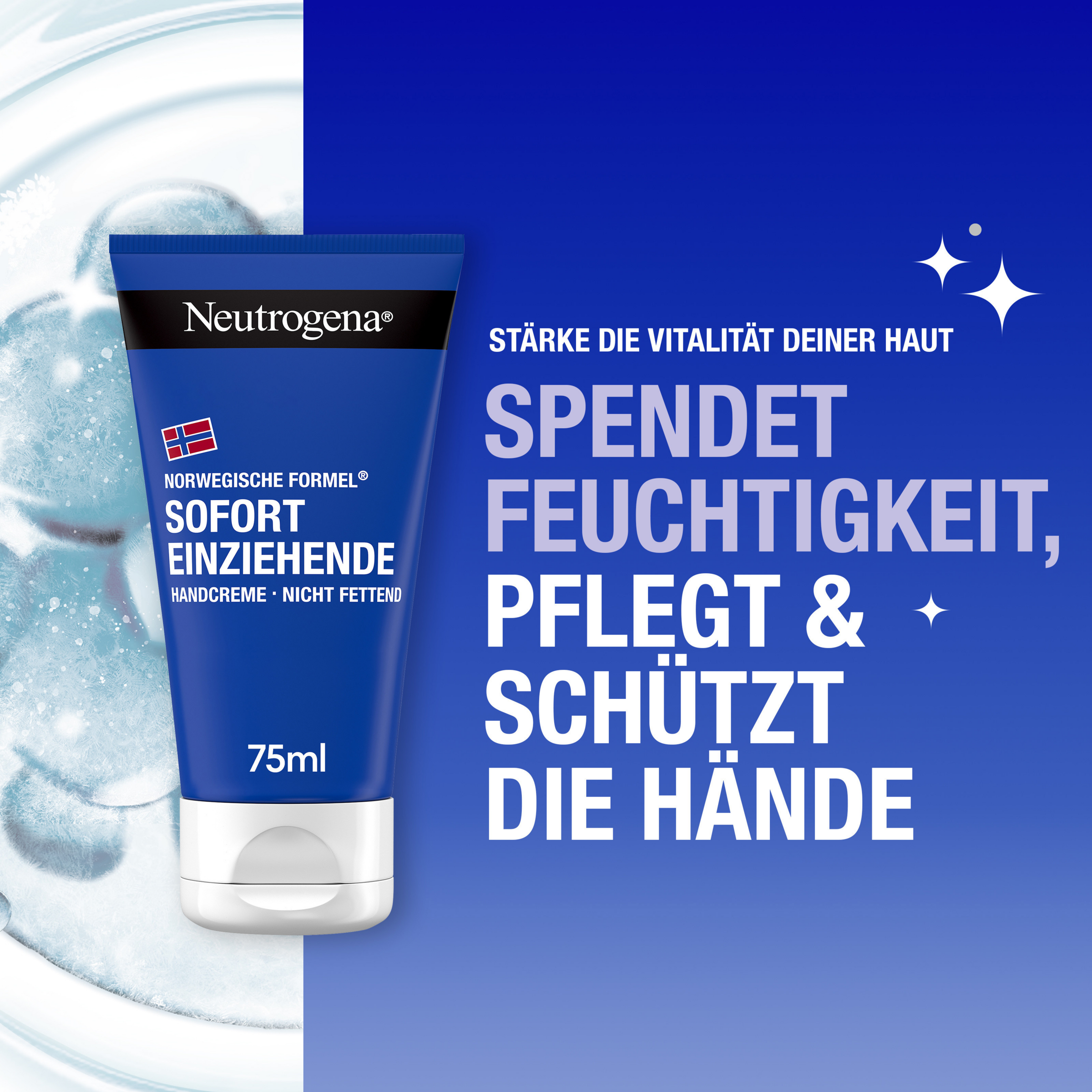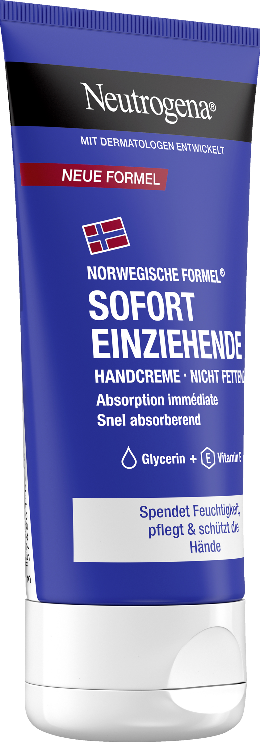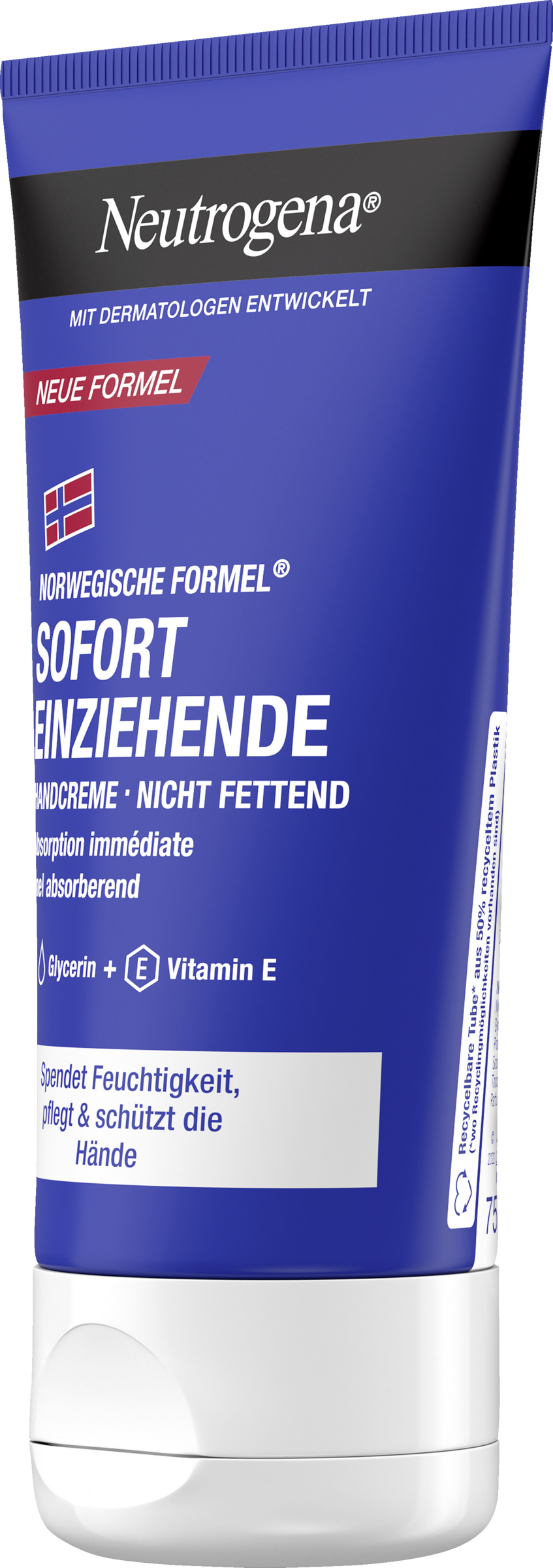 Den øjeblikkeligt absorberede håndcreme fra Neutrogena med sin lette, ikke-fedtende formel efterlader huden blød og smidig umiddelbart efter påføring. Derudover giver håndcremen til tørre hænder med glycerin + E-vitamin huden langvarig fugt og har videnskabeligt vist sig at beskytte hudbarrieren. Fugtighedscremen i en genanvendelig tube* er også velegnet til følsom hud, og tuben er fremstillet af 50 % genbrugsplast.