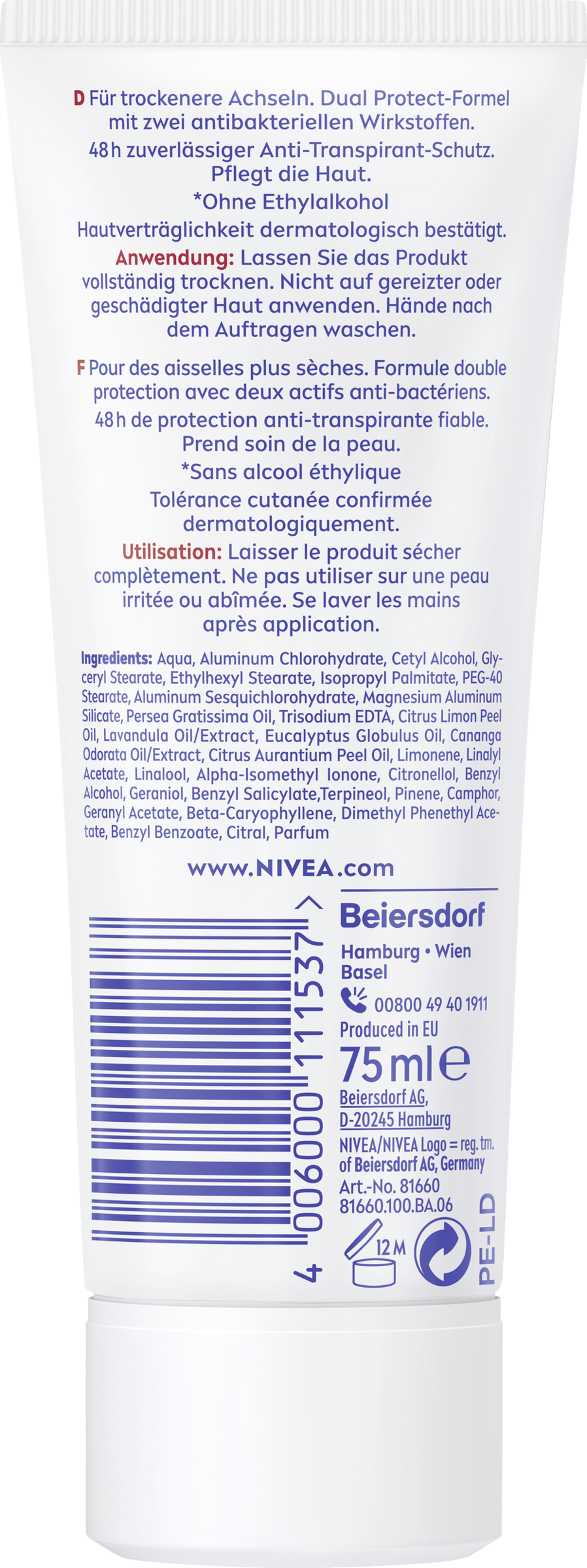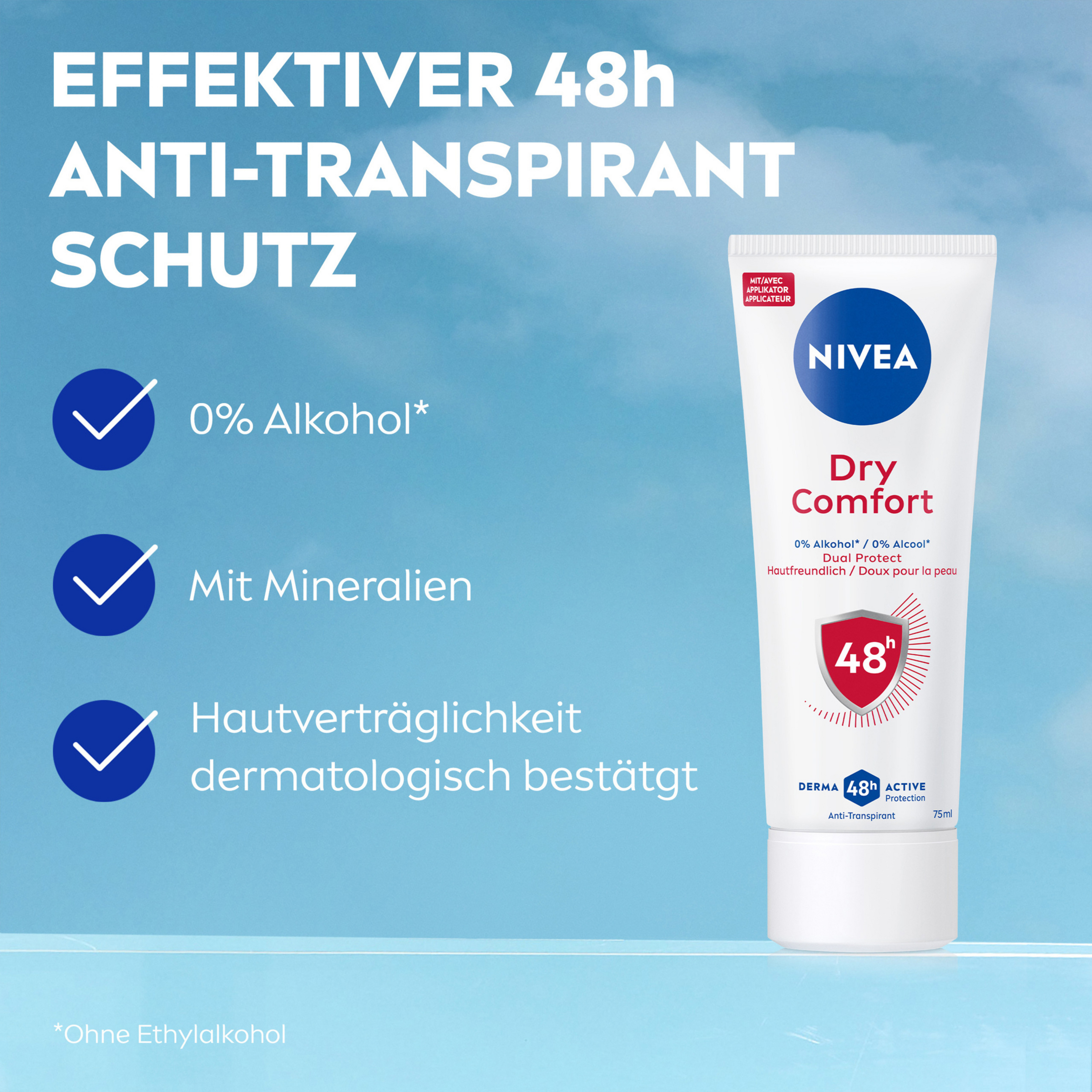 NIVEA Dry Comfort Anti-Perspirant Cream giver pÄlidelig beskyttelse og plejer din hud med Dual Protect-teknologi og 0 % alkohol. Antiperspiranterne giver Derma 48 timers aktiv beskyttelse: Produkterne arbejder sammen med huden for pÄlidelig og stÊrk effektivitet mod sved og lugt med hudvenlige formuleringer.