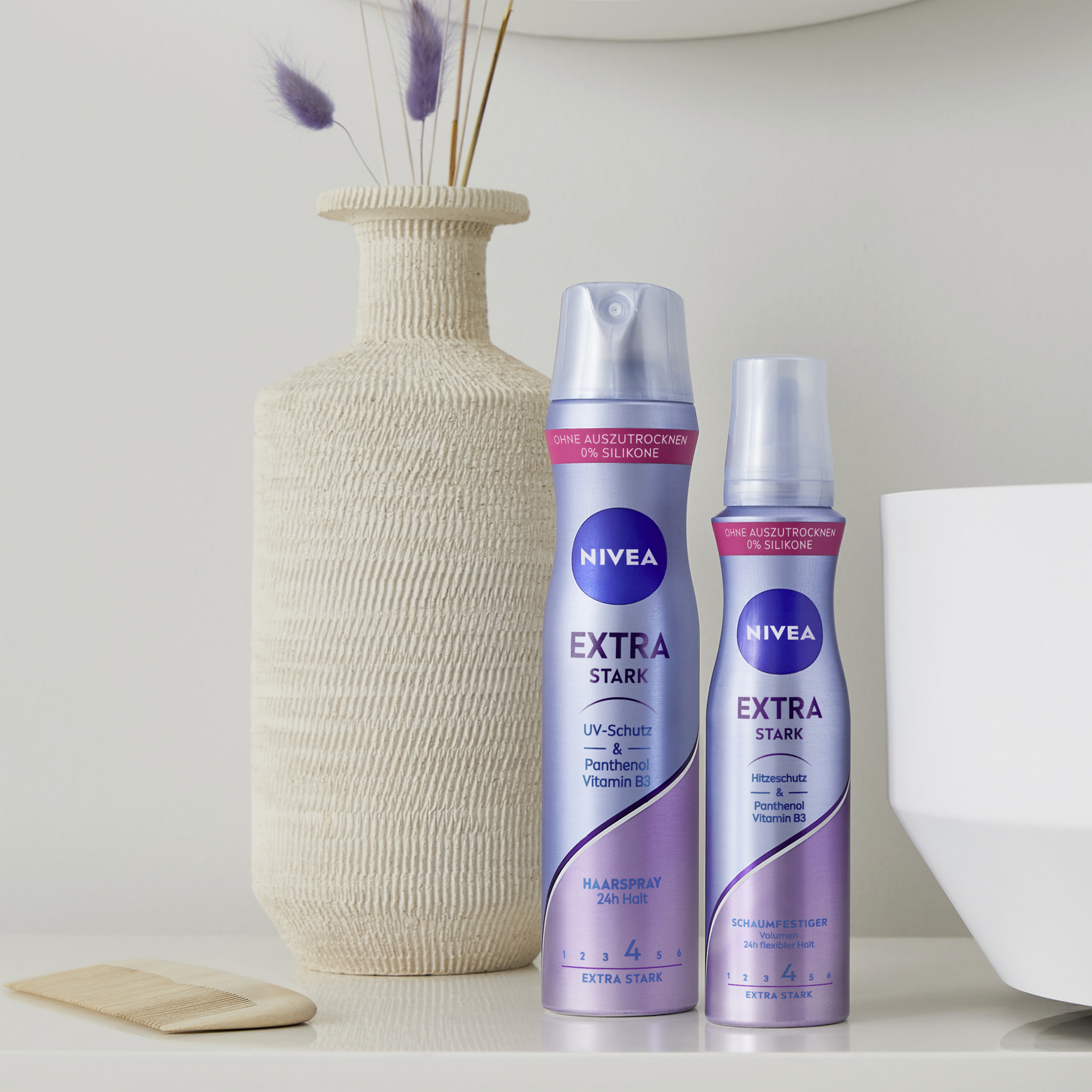 Effektiv styling til smukt hår med NIVEA Extra Strong Styling Mousse. I kombination med stylingsprayen giver de to NIVEA-produkter med Hold Level 4 et ekstra stærkt hold til forskellige frisurer. Ideel til sofistikerede looks, der skal holde hele dagen - uden at gå på kompromis.
