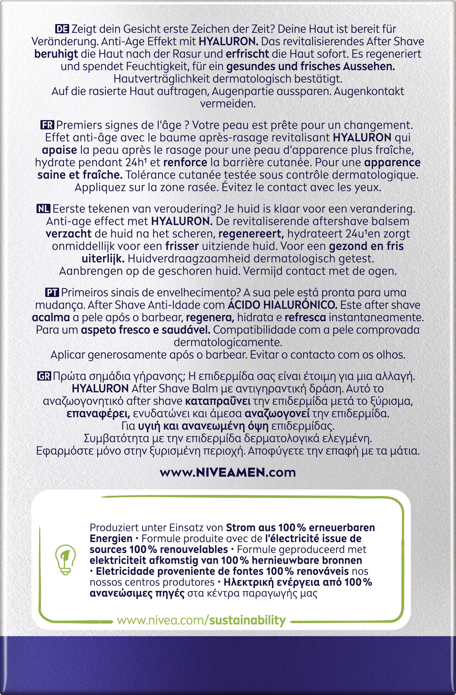 Hvis du er på udkig efter en alt-i-en-løsning til irritation efter barbering, er Anti-Age Hyaluron After Shave Balm fra NIVEA MEN lige noget for dig. Denne balm er ikke kun udviklet til at lindre hudirritationer, men også til at revitalisere og intensivt fugte din hud. Den har en række fordele, som sikrer, at din hud føles optimeret og øjeblikkeligt opfrisket. Balmen fugter i 24 timer, reducerer fine linjer og rynker takket være dens anti-age-egenskaber og efterlader huden med et ungdommeligt og strålende udseende. Takket være den hurtigt absorberende formel er balmen nem at påføre og sikrer en glat og sund hud på ingen tid. Balmens hudkompatibilitet er blevet dermatologisk bekræftet.