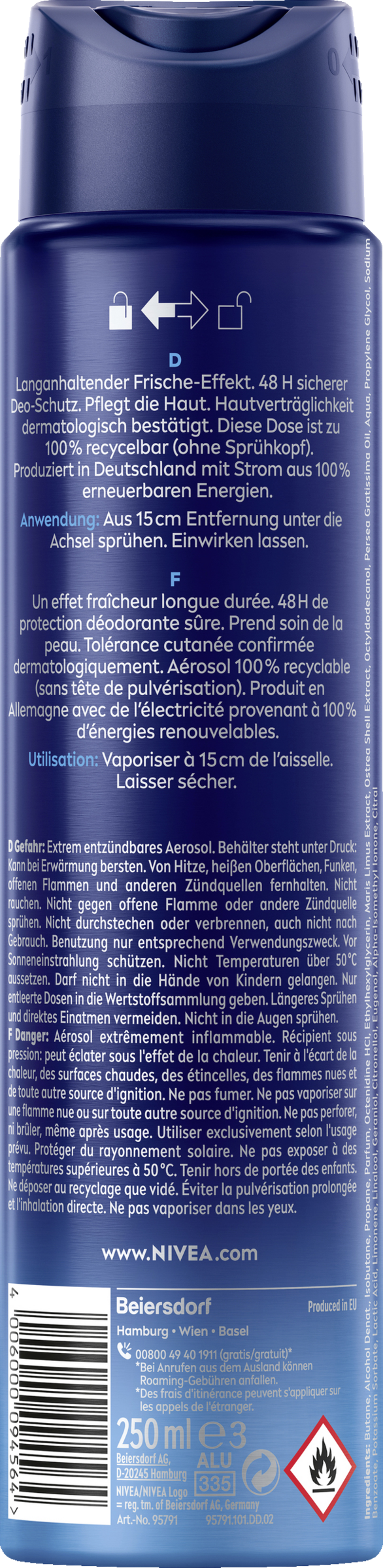 Ekstremt antændelig aerosol. Beholder under tryk: Kan sprænge ved opvarmning. Hold afstand til varme, varme overflader, gnister, åben ild og andre antændelseskilder. Ryg ikke i nærheden. Sprøjt ikke mod åben ild eller andre antændelseskilder. Må ikke punkteres eller brændes, heller ikke efter brug. Anvendelse kun i overensstemmelse med det tilsigtede formål. Beskyttes mod sollys. Udsæt ikke enheden for temperaturer over 50 °C. Må ikke komme i nærheden af børn. Aflever kun tomme dåser til indsamling af genpåførelige materialer. Undgå at spraye i længere tid og indånde produktet direkte. Må ikke sprøjtes i øjnene. Må ikke anvendes på irriteret eller stresset hud.