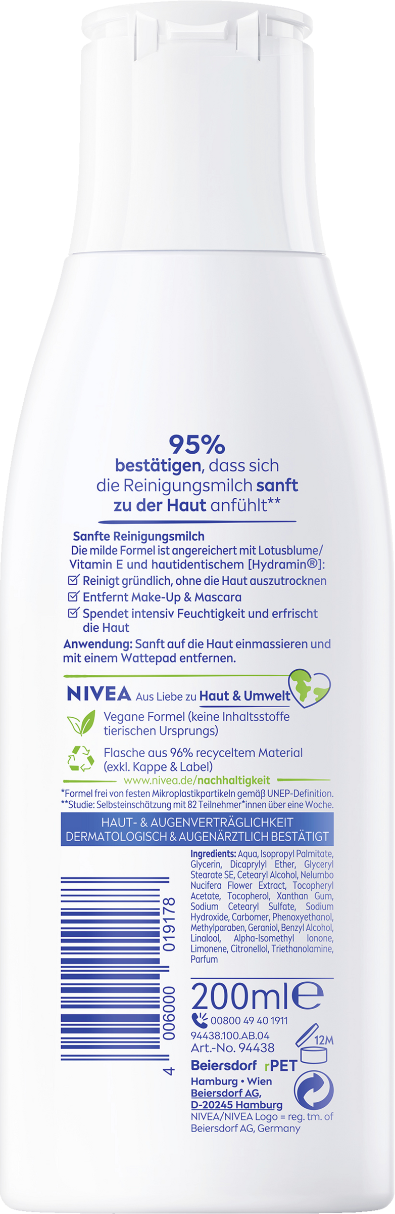 NIVEA Gentle Cleansing Milk er beriget med lotusblomst/vitamin E og hudidentisk Hydramin®, som effektivt binder fugt og afbalancerer hudens naturlige fugtbalance. Den er specielt udviklet til normal og tør hud og renser ikke kun grundigt og fjerner makeup og vandfast mascara, men fugter også intensivt og opfrisker huden uden at udtørre den - så huden ser sund og frisk ud. Ved brug masseres rensemælken forsigtigt ind i huden og fjernes med en vatrondel. Af hensyn til hud og miljø: Rensemælkens fugtgivende formel er vegansk*, og flasken er fremstillet af 96 % genbrugsmateriale (ekskl. hætte og etiket).