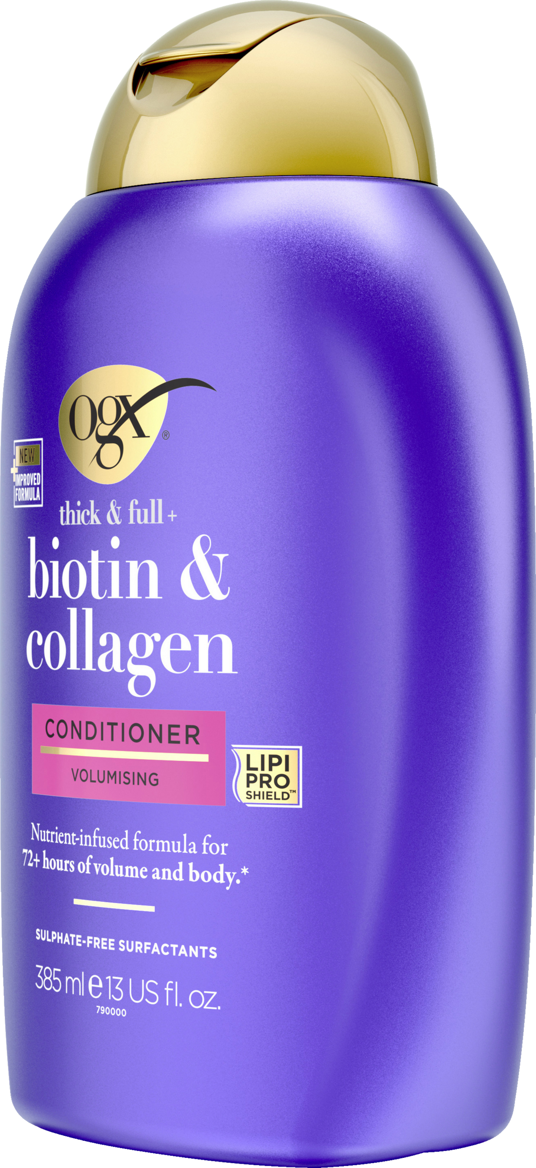 Volumenbalsam til fint og tyndt hår: OGX Biotin & Collagen Conditioner giver fint og tyndt hår mere volumen og intens fylde* i 72+ timer takket være den rige plejeformel. Den nye og forbedrede formel med patenteret LipiPro Shield-teknologi beskytter lipid- og proteinbarrieren og giver et sundt udseende hår. Derudover hjælper balsammen uden sulfatholdige overfladeaktive stoffer med at skabe velplejet og forførende duftende hår.