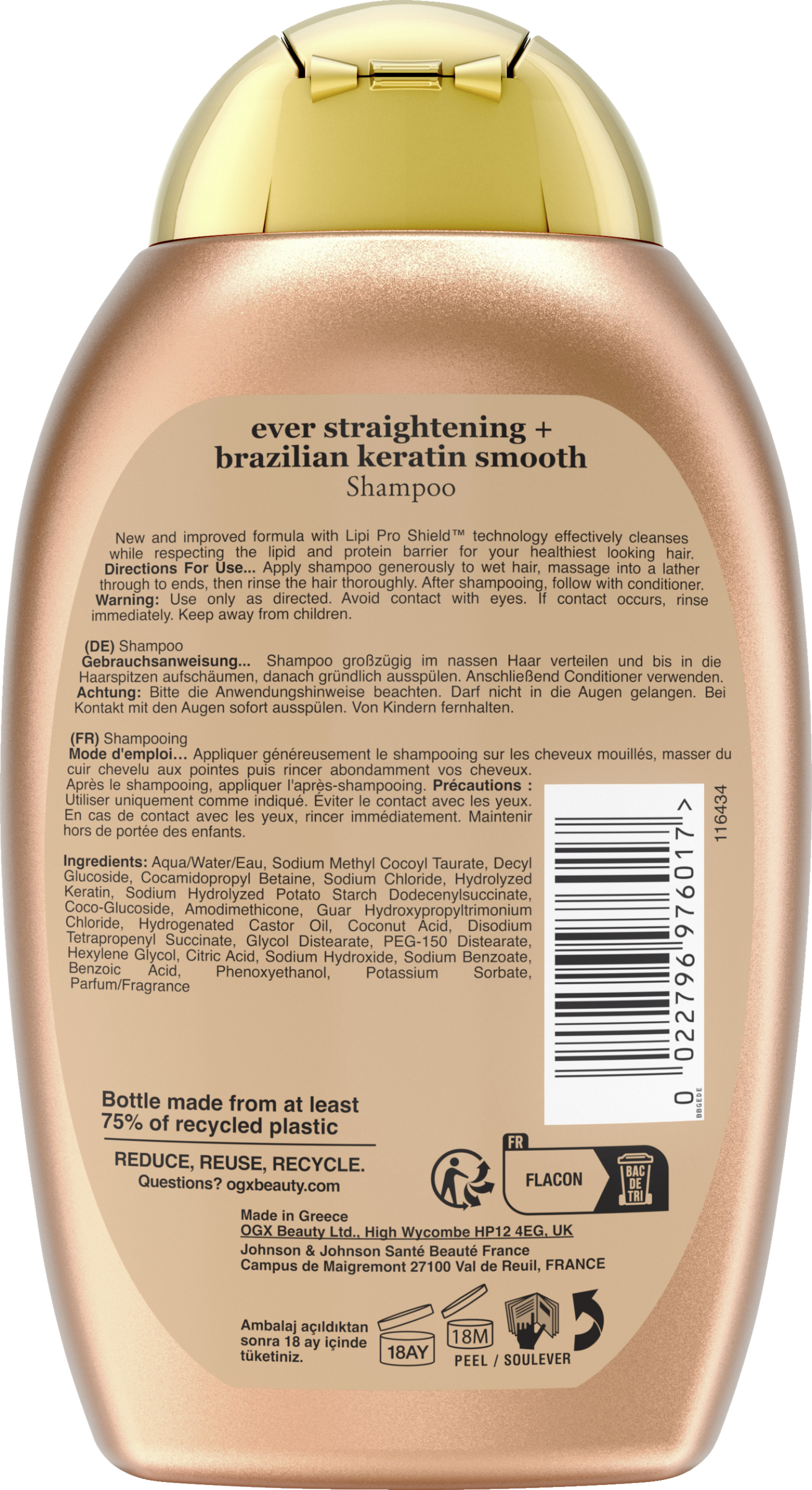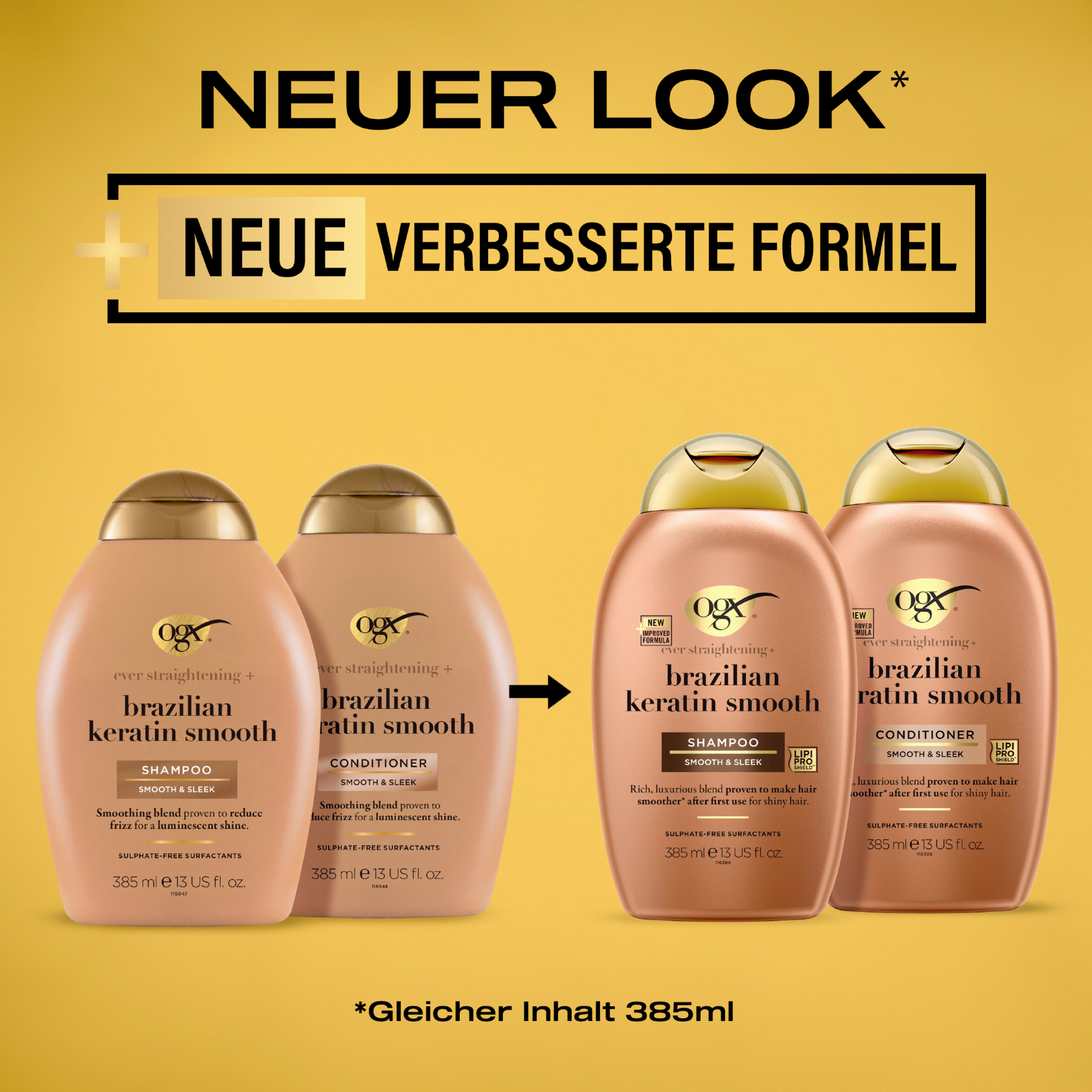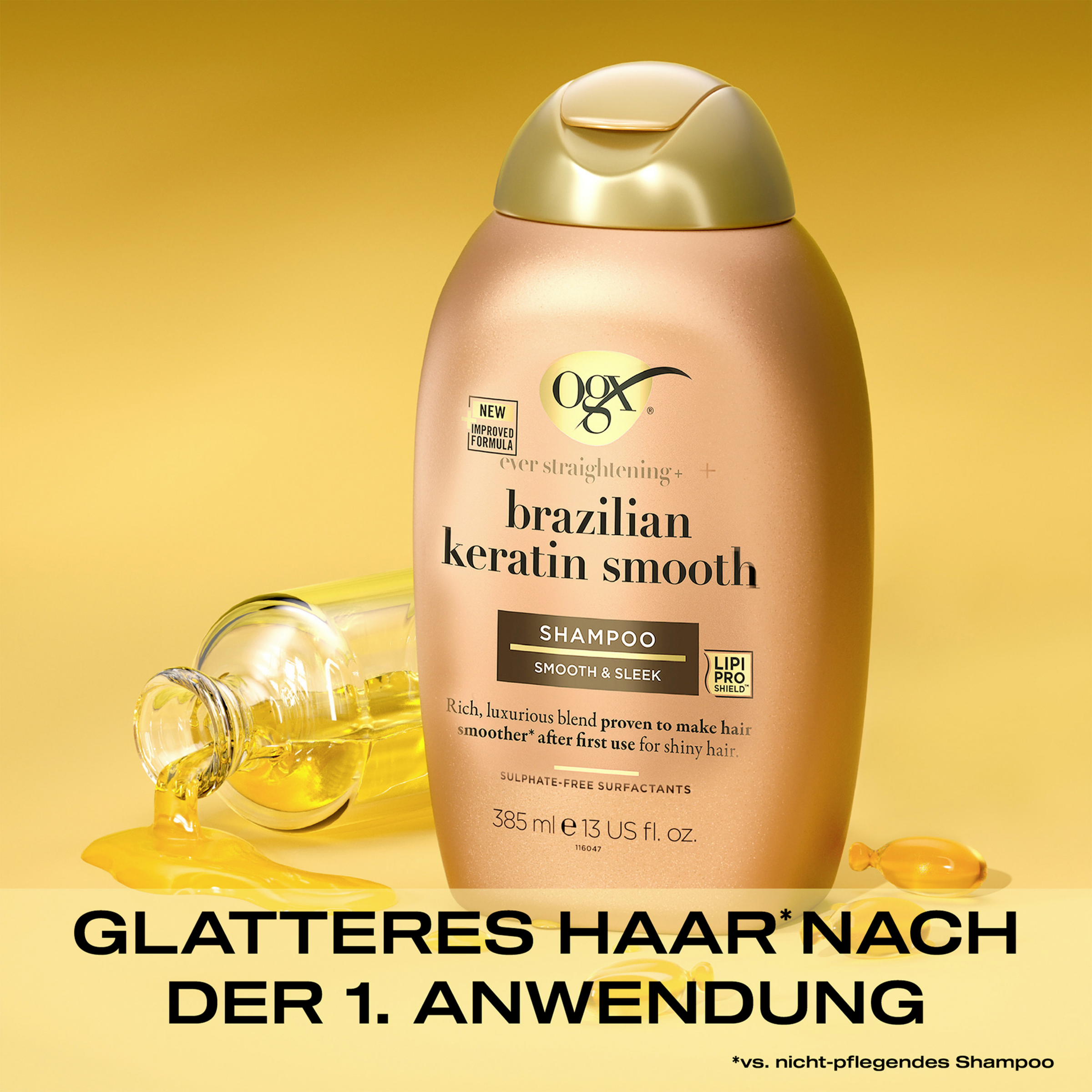 OGX Brazilian Keratin Smooth Shampoo sikrer med sin eksotiske formel og mange superfoods et stærkere og glattere hår og udglatter hårets struktur. Brasiliansk kokosolie, keratinproteiner, kokossmør og avocadoolie giver langvarig glathed og smidighed samt en strålende glans. Den nærende keratinshampoo er særligt velegnet til kruset, krøllet eller bølget hår og renser, plejer og styrker håret på samme tid.