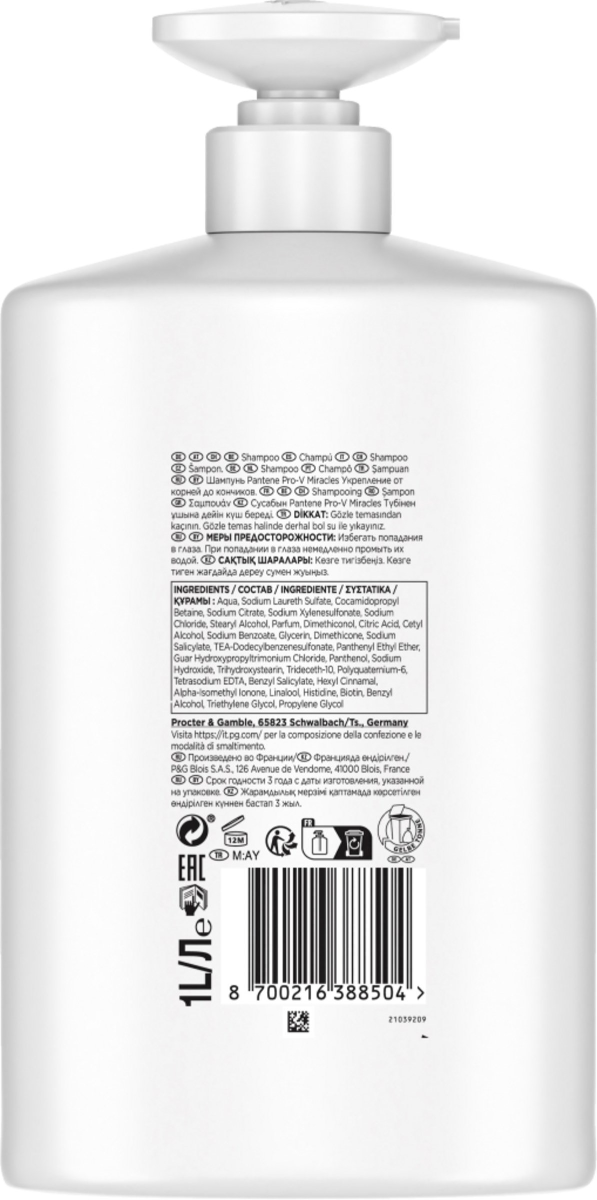 Aqua, Sodium Laureth Sulfate, Cocamidopropyl Betaine, Sodium Citrate, Sodium Xylenesulfonate, Sodium Chloride, Stearyl Alcohol, Parfum, Dimethiconol, Citric Acid, Cetyl Alcohol, Sodium Benzoate, Glycerin, Dimethicone, Sodium Salicylate, TEA-Dodecylbenzenesulfonate, Panthenyl Ethyl Ether, Guar Hydroxypropyltrimonium Chloride, Panthenol, Sodium Hydroxide, Trihydroxystearin, Trideceth-10, Polyquaternium-6, Tetrasodium EDTA, Benzyl Salicylate, Hexyl Cinnamal, Alpha-Isomethyl Ionone, Linalool, Histidine, Biotin, Benzyl Alcohol, Triethylene Glycol, Propylene Glycol