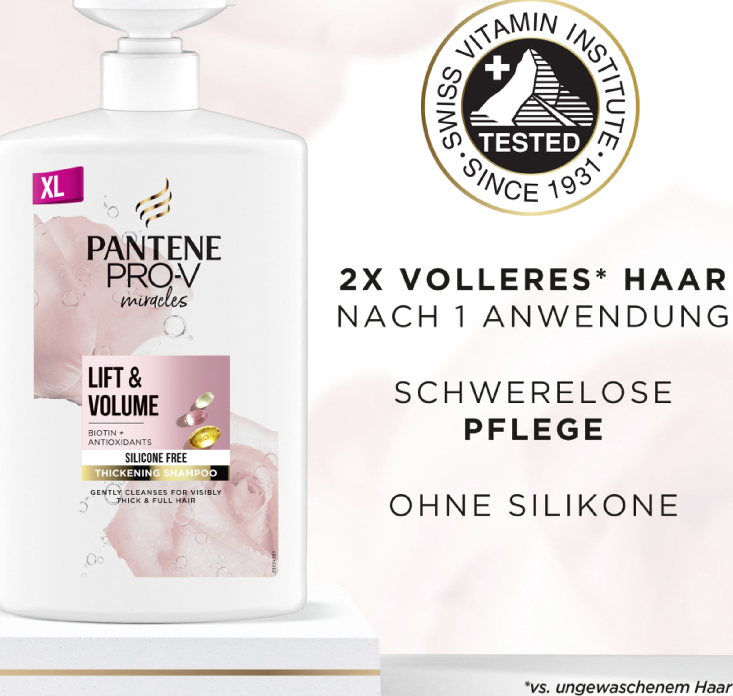 Denne unikke Pantene Pro-V hair thickening shampoo med biotin, antioxidanter og den højeste koncentration af Pro-V styrker tyndt, glansløst hår og gør det synligt tykkere og fyldigere - selv efter første anvendelse. Den fri for silikone shampoo indeholder 3x mere Pro-V end Pantene Pro-V Repair &; Care Shampoo. Det bedste resultat opnås ved at bruge den sammen med de andre hårprodukter i Miracles Lift &; Volume-serien.