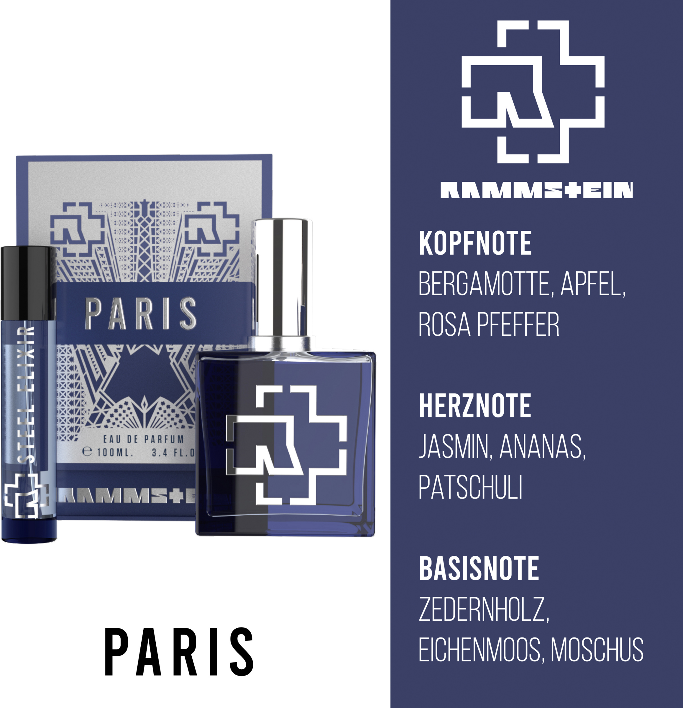 PARIS for Him + ELIXIR, en frisk duft med en moseagtig, træagtig finish. STEEL ELIXIR fra det berygtede molekyle: ISO-E Super, en hyldest til stålkonstruktionen i det parisiske vartegn.