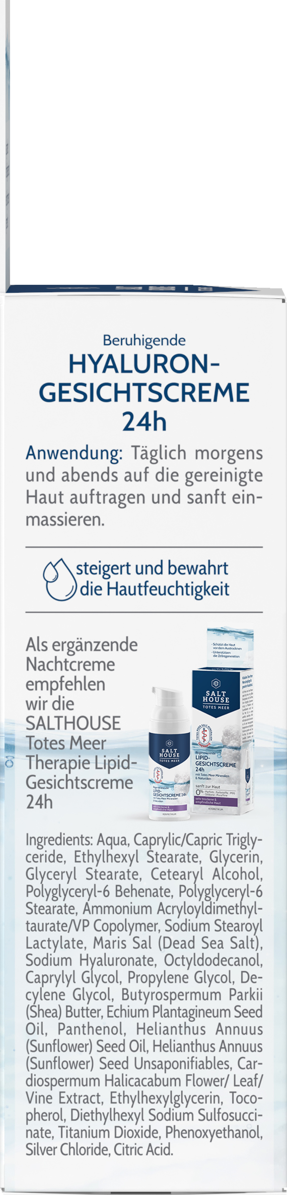 Aqua, Caprylic/Capric Triglyceride, Ethylhexyl Stearate, Glycerin, Glyceryl Stearate, Cetearyl Alcohol, Polyglyceryl-6 Behenate, Polyglyceryl-6 Stearate, Ammonium Acryloyldimethyltaurate/VP Copolymer, Sodium Stearoyl Lactylate, Maris Sal (Dead Sea Salt), Sodium Hyaluronate, Octyldodecanol, Caprylyl Glycol, Propylene Glycol, Decylene Glycol, Butyrospermum Parkii (Shea) Butter, Echium Plantagineum Seed Oil, Panthenol, Helianthus Annuus (Sunflower) Seed Oil, Helianthus Annuus (Sunflower) Seed Unsaponifiables, Cardiospermum Halicacabum Flower/Leaf/Vine Extract, Ethylhexylglycerin, Tocopheryl Acetate, Diethylhexyl Sodium Sulfosuccinate, Titanium Dioxide, Phenoxyethanol, Silver Chloride, Citric Acid