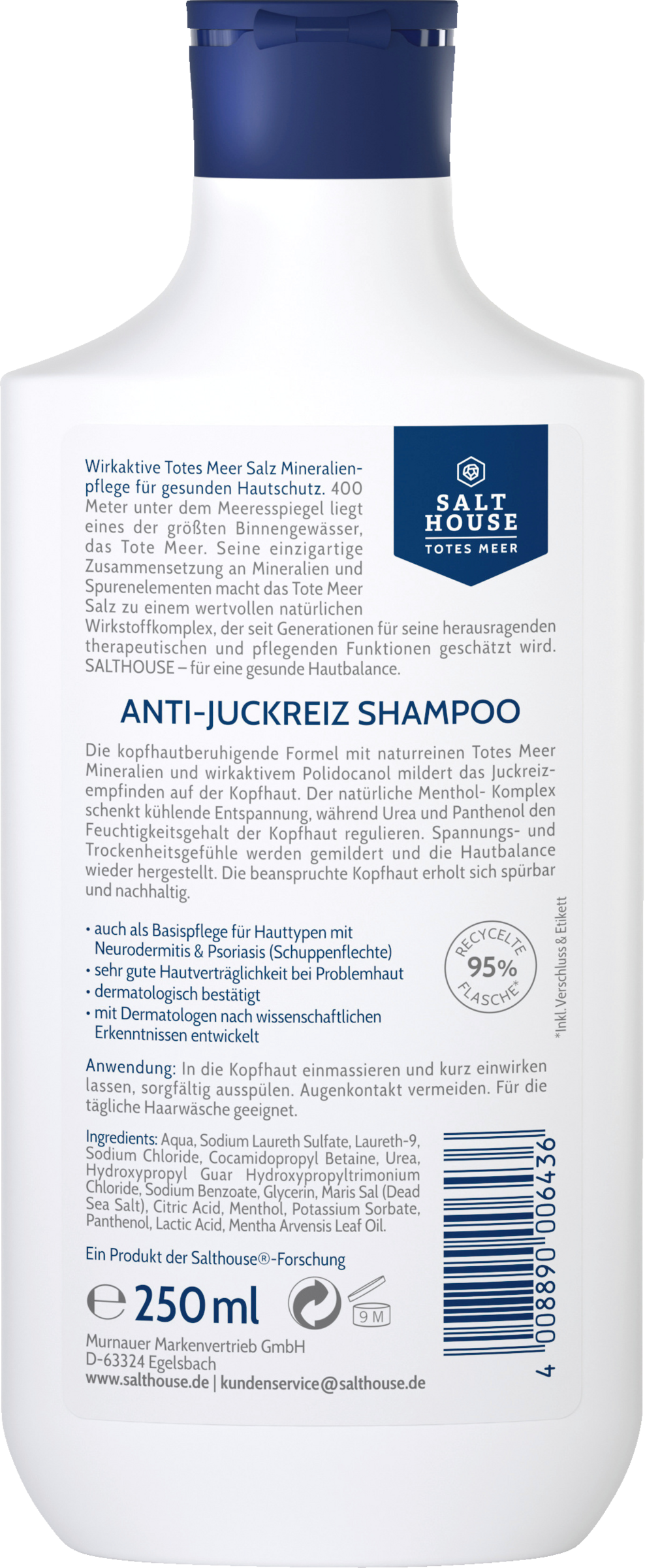 Den fugtighedsgivende formel med naturrene Dødehavs-mineraler og aktivt virkende Polidocanol beroliger hovedbunden med det samme og mildner den kløende fornemmelse. Naturlig mynteolie giver kølende afslapning, mens urea og panthenol regulerer hovedbundens fugtighedsbalance. Spændings- og tørhedsfornemmelser mildnes, og hudens balance retableres. Den stressede hovedbund restitueres mærkbart og bæredygtigt